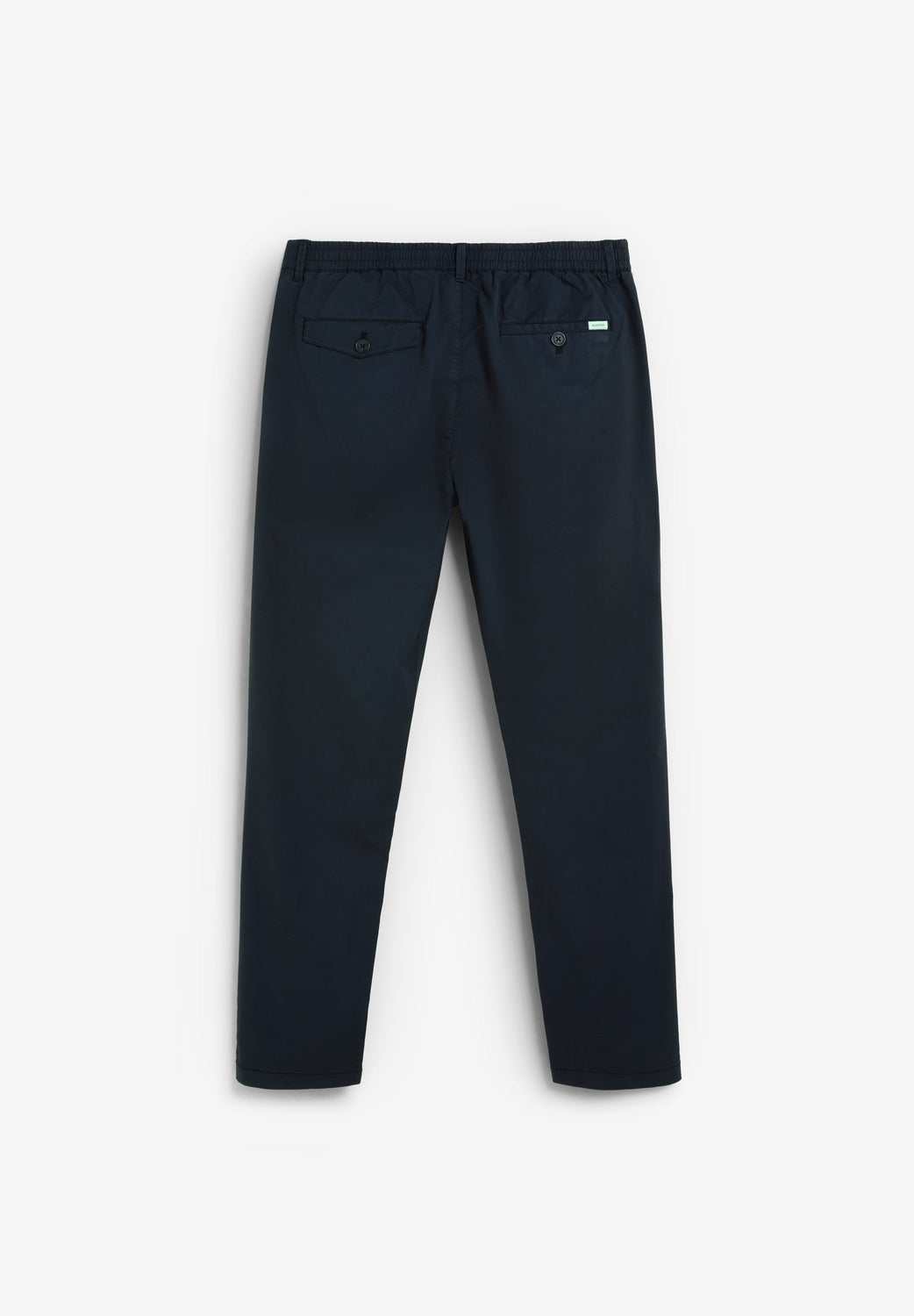 Trousers made of slightly stretchy cotton. Drawstring waist with belt loops. Slanted pockets and front darts.
