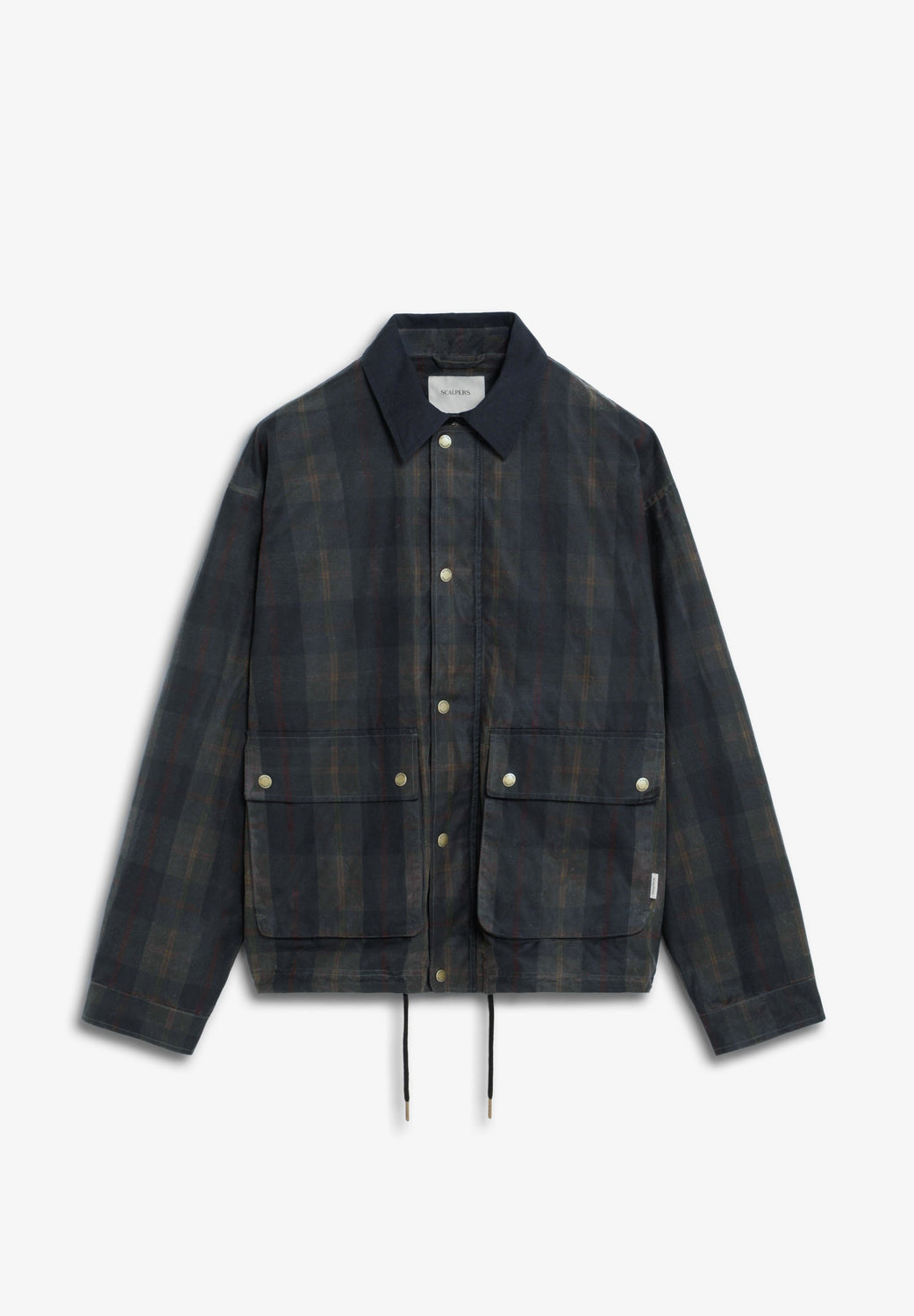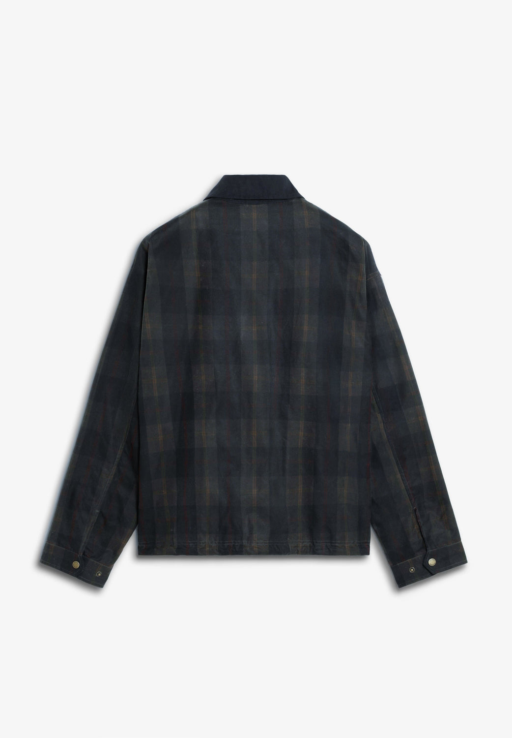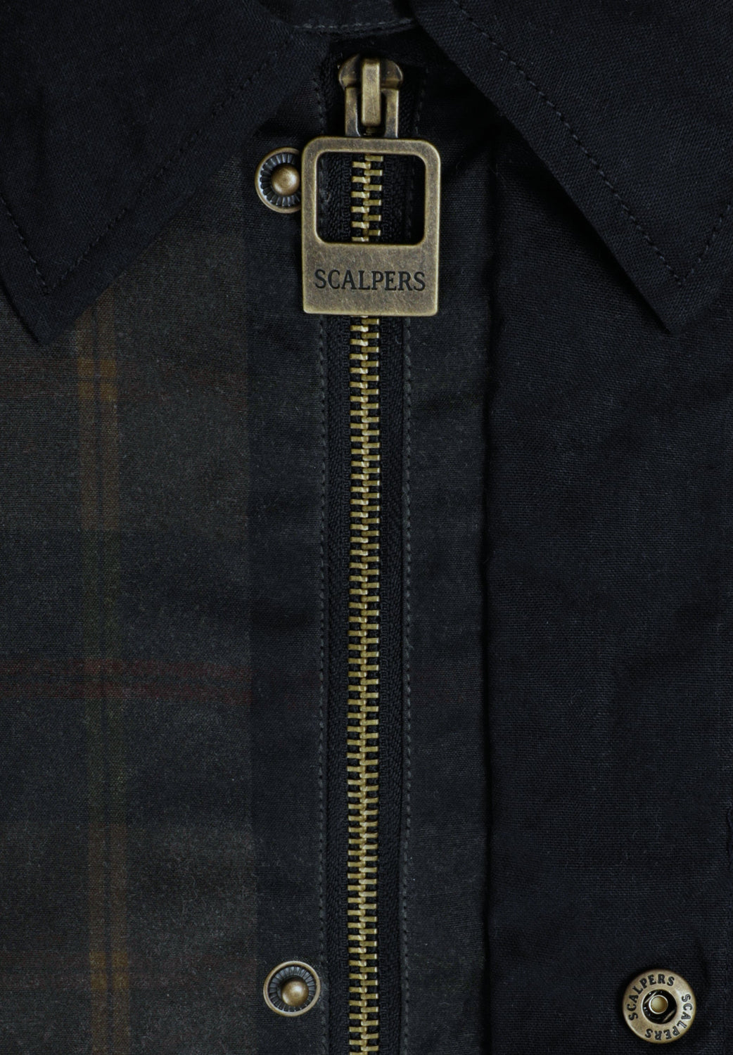 Checked jacket made of 100% waxed cotton. Contrasting collar. Concealed main zip fastening with customised zip puller and buttoned placket. Two front patch pockets with press-stud fastening. Two side pockets. Pointed cuffs with press-stud fastening.