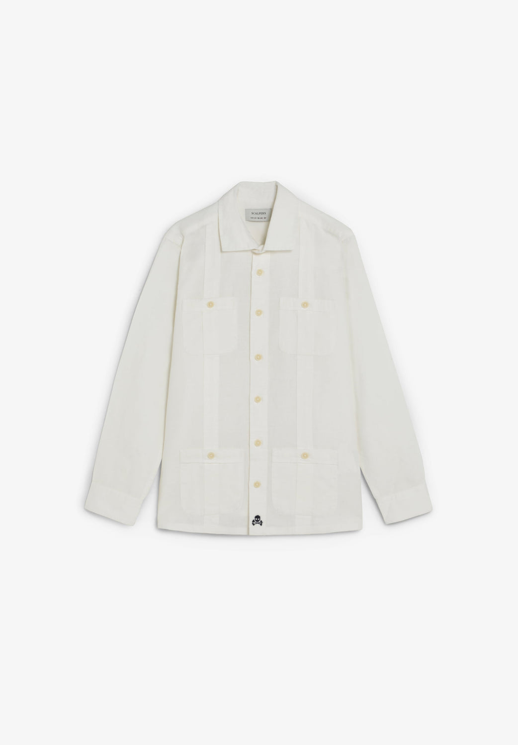 Guayabera style shirt made of a cotton and linen blend. Regular fit. Classic collar and long sleeves with buttoned cuffs. Patch pockets with button at the front. Embroidered skull detail on the hem. Front button fastening.
