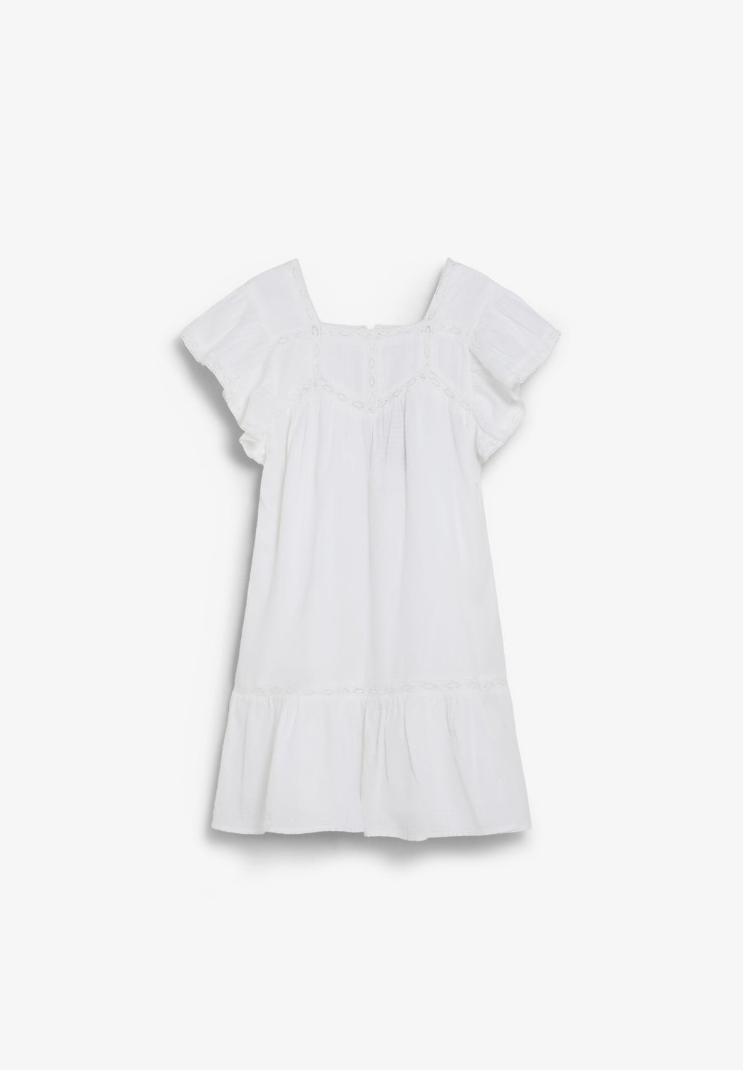 Mini dress made of 100% BCI cotton. Square neckline and ruffled sleeves. Lace details on the chest and edges. Button fastening at the back. Ruffled hem.