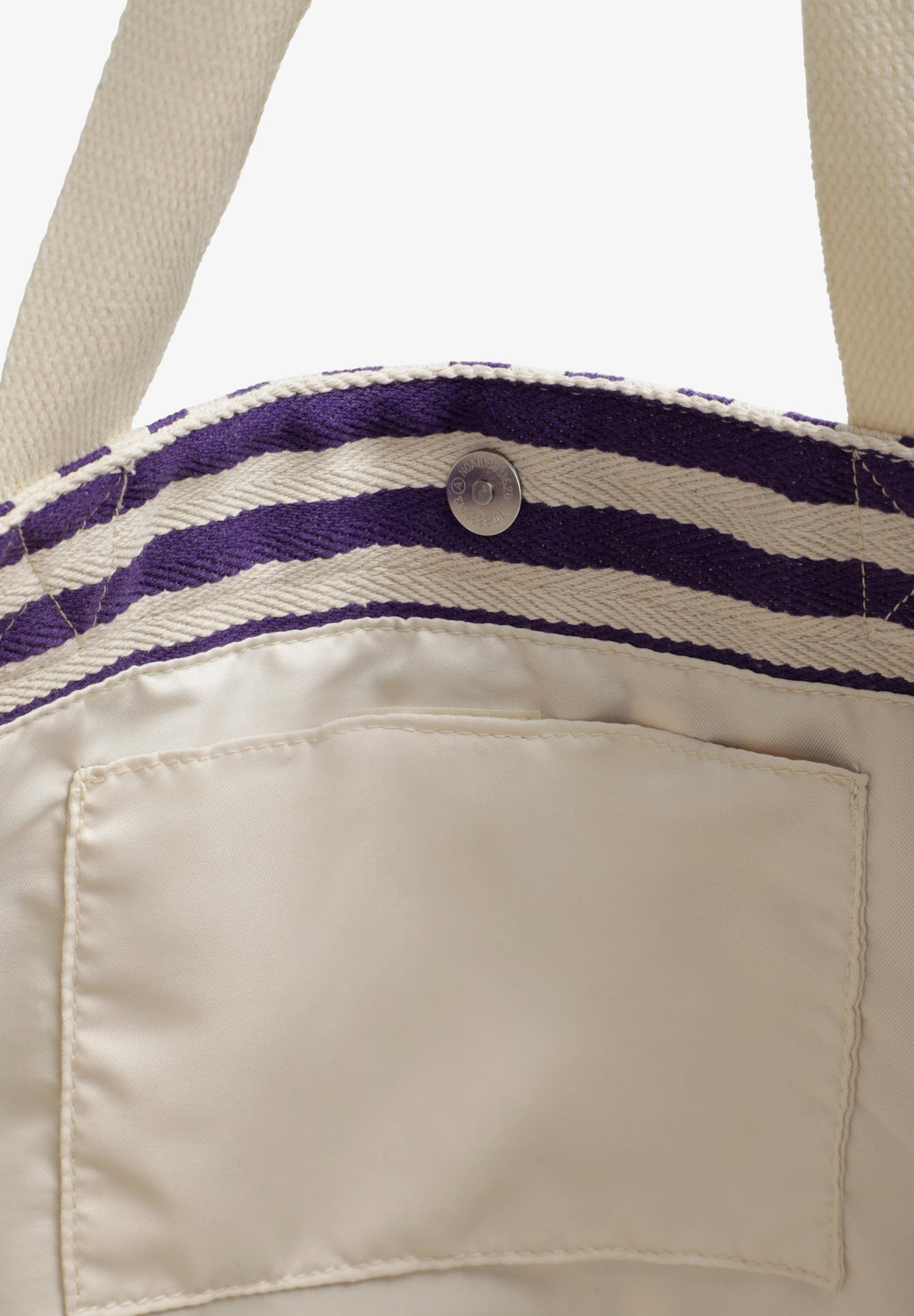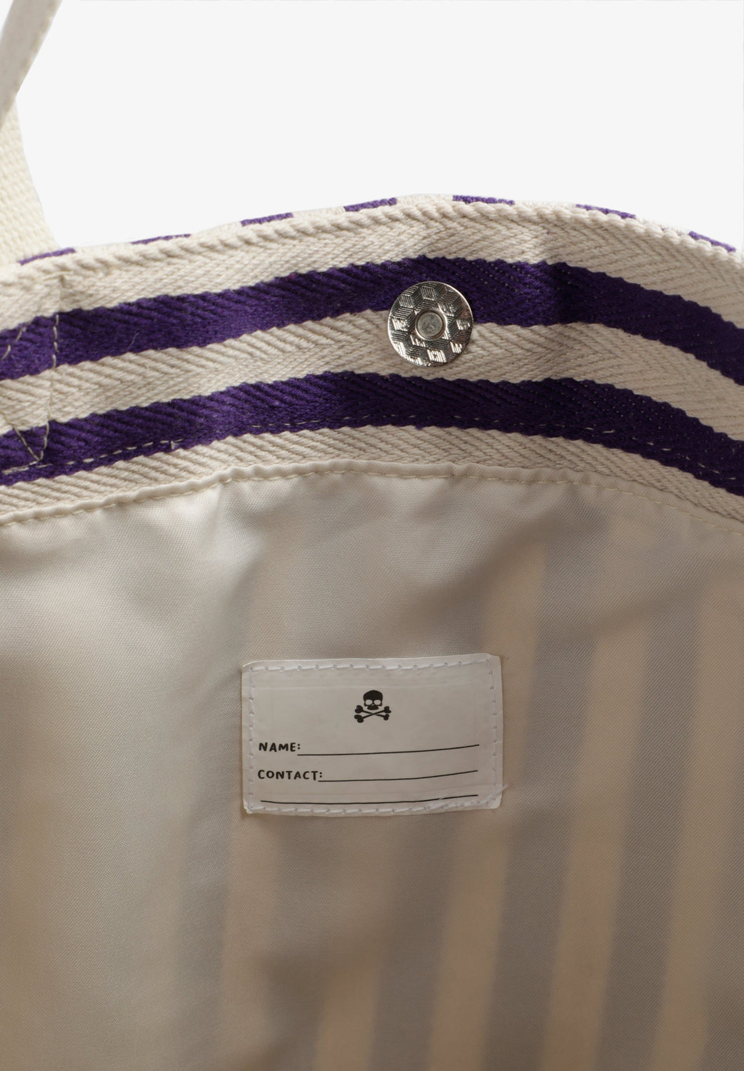 Tote bag made of hard-wearing fabric and printed with contrast stripes. Embroidered skull on the front. Double straps and magnetic button fastening. Includes name tag and inner pocket.