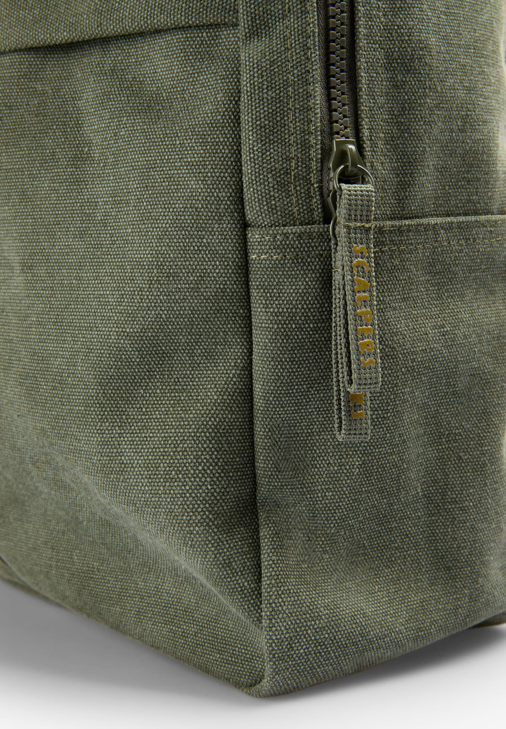Backpack made of a canvas fabric. Top handle. Additional pocket at the front. Embroidered patch on the front. Inner compartment. Includes name tag inside.
