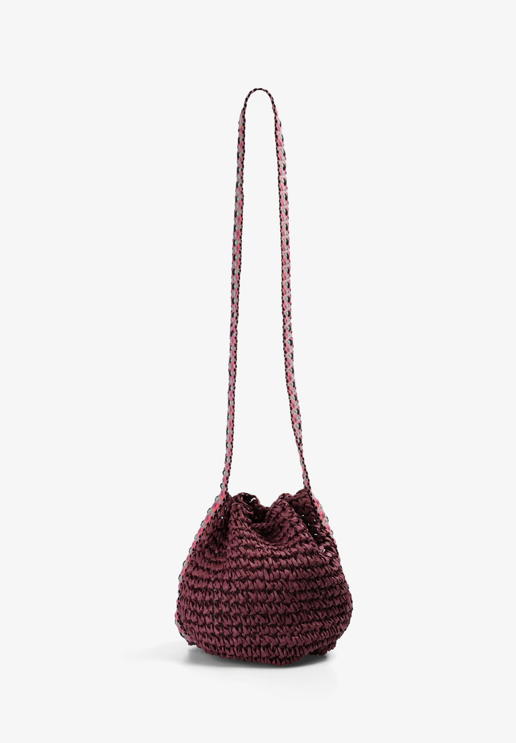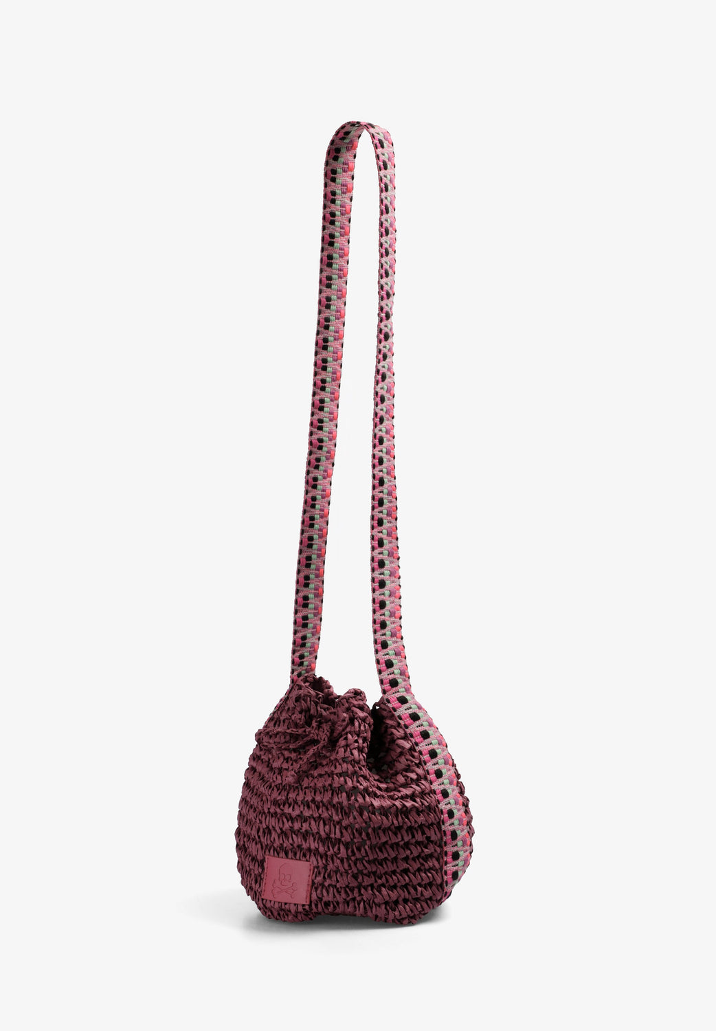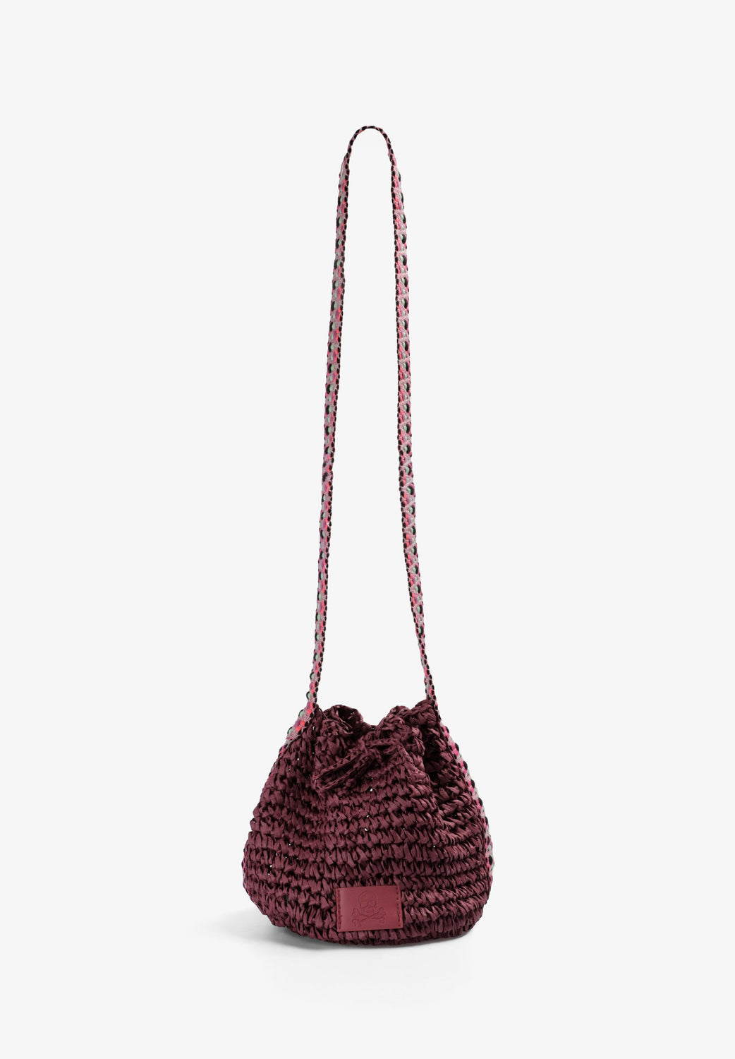 Raffia bucket bag. Multicoloured braided handle. Adjustable drawstring closure. Patch with engraved skull.