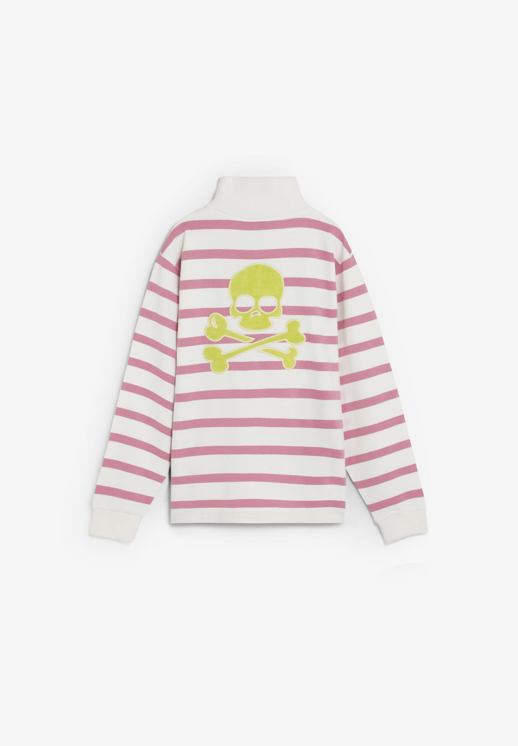 Sweatshirt made of 100% BCI cotton. Long sleeves. High neck with contrast zip. Front pouch pockets. Striped print. Embroidered skull on back. Logo detail on the chest Ribbed trim.