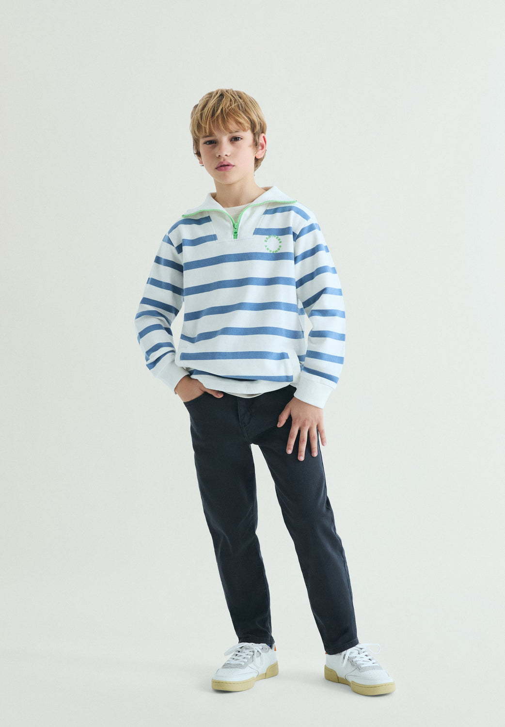 Striped sweatshirt made of 100% BCI cotton with polo shirt collar. Front zip fastening. Pouch pocket. Logo detail on chest and printed skull logo on back. Ribbed cuffs and hem.