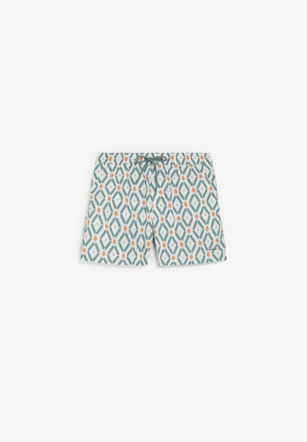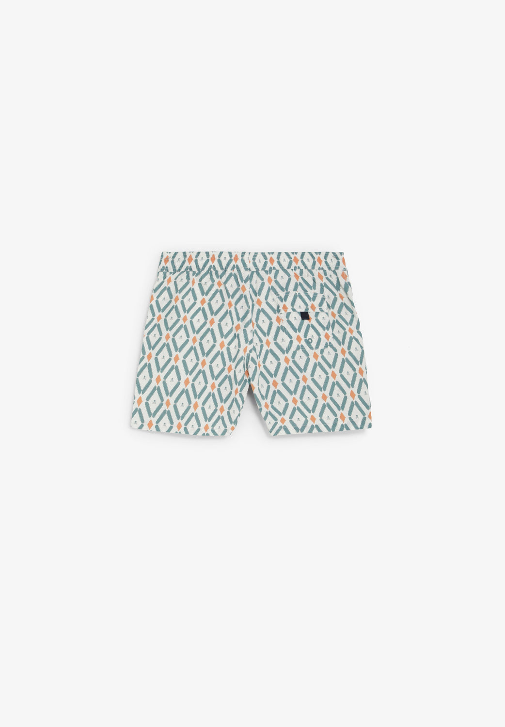 Swimming trunks with elasticated waistband and drawstring. Side pockets. Contrast print. Back pocket.