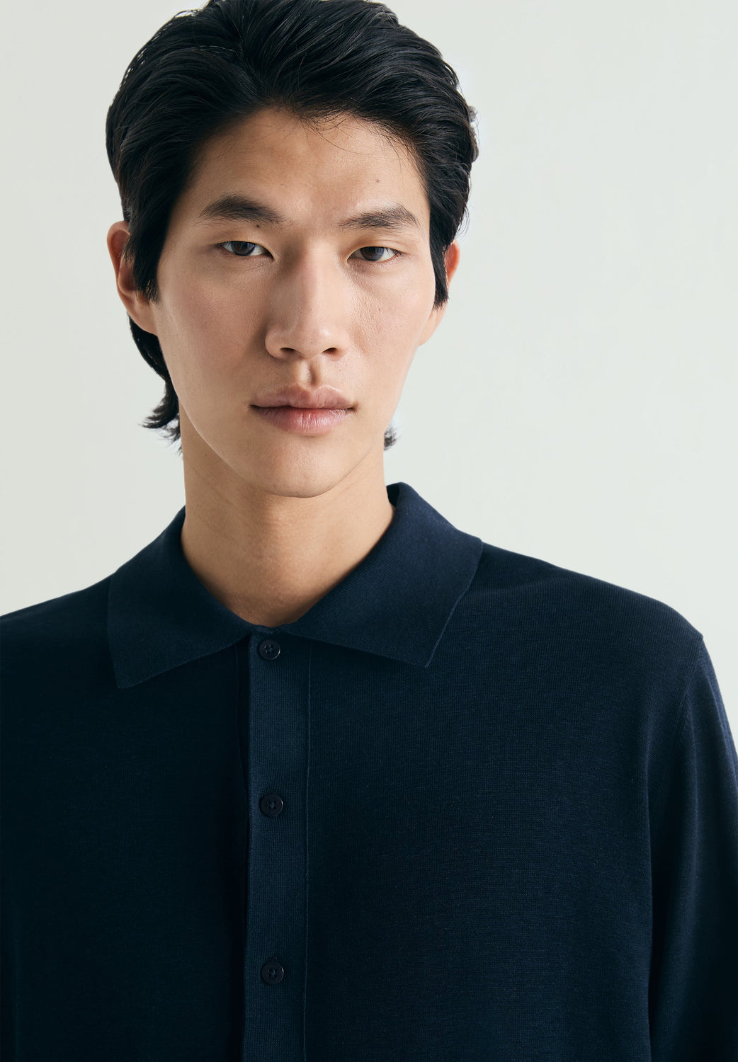 Polo shirt style cardigan made of cotton and silk fine knit blend. Polo shirt collar and long sleeves. Front button fastening.