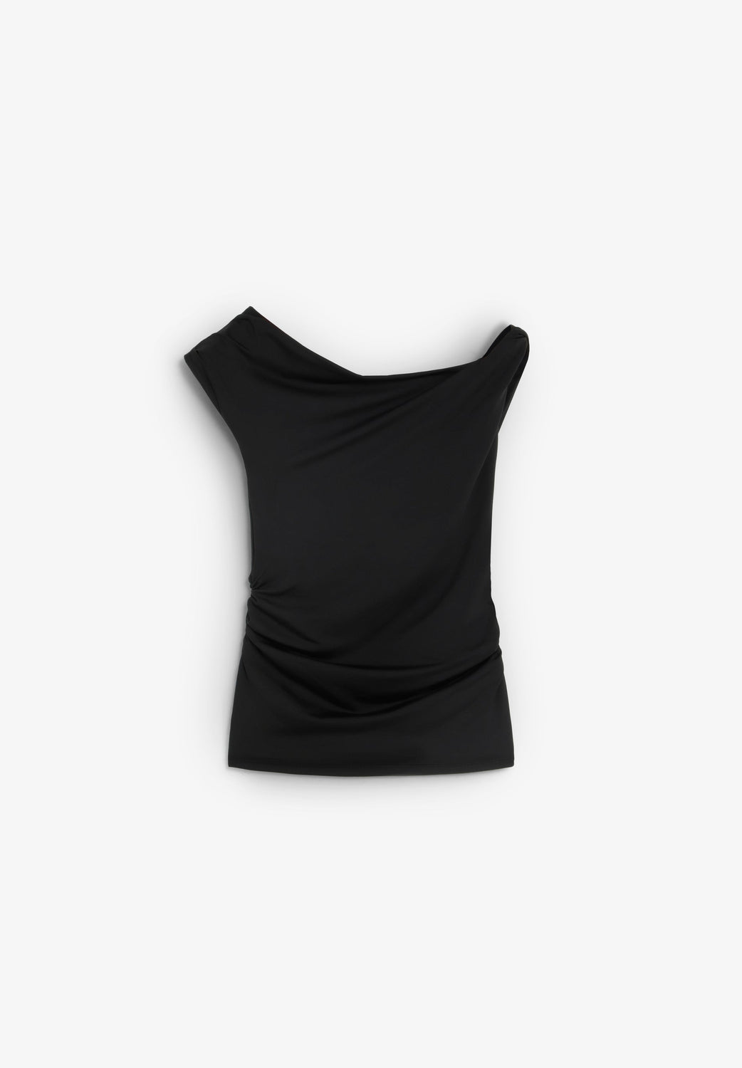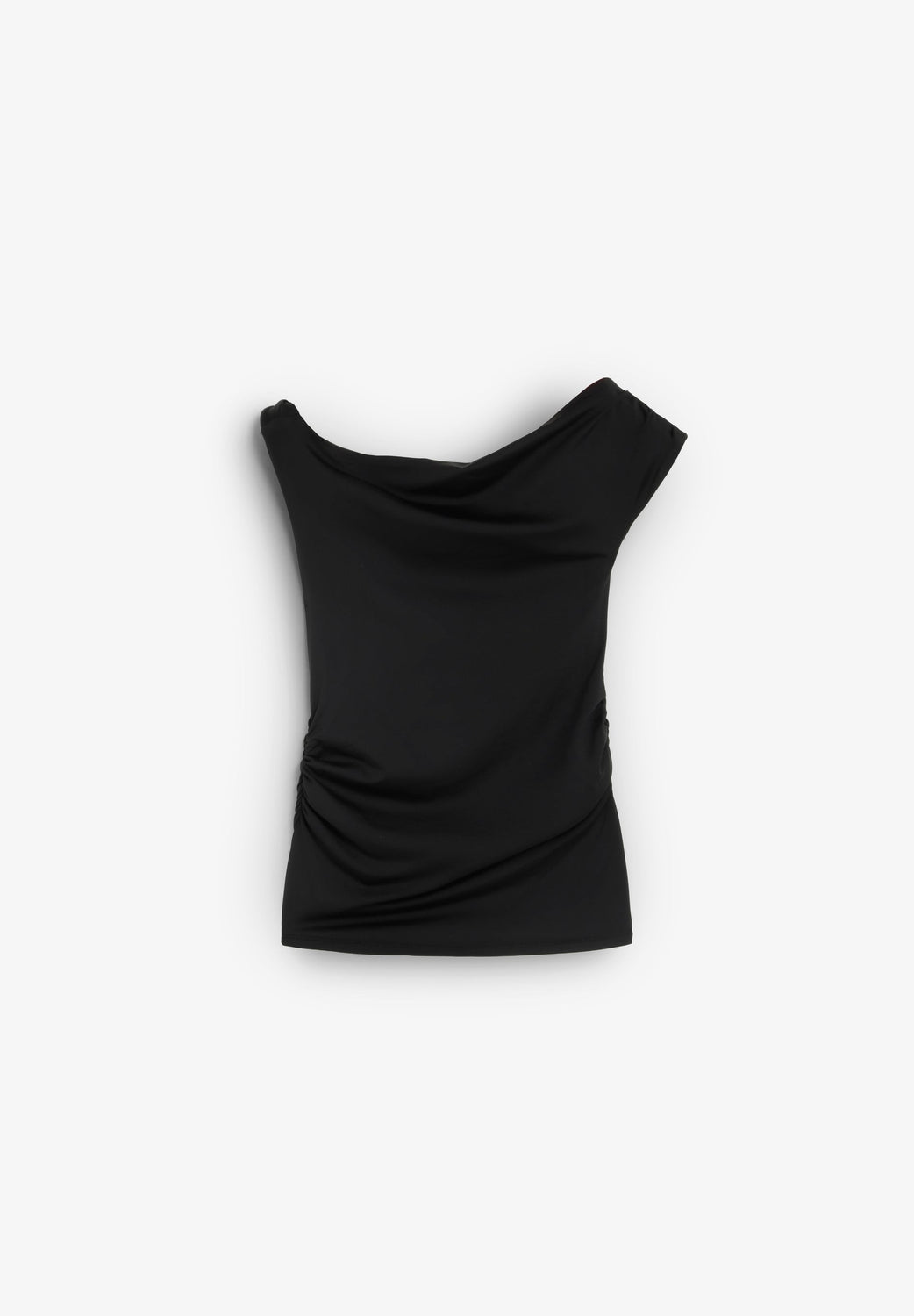 Draped T-shirt made of a slightly stretchy fabric. Slim fit, draped asymmetric neckline shirred on one shoulder.