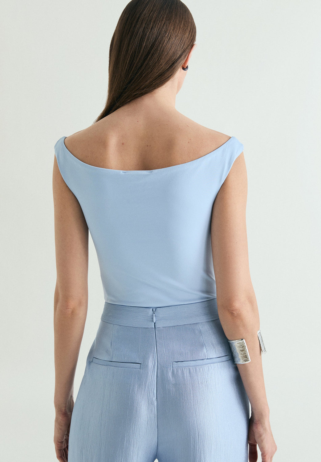 Bodysuit made of a slightly stretchy fabric. Slim fit, round neckline with off the shoulder straps.