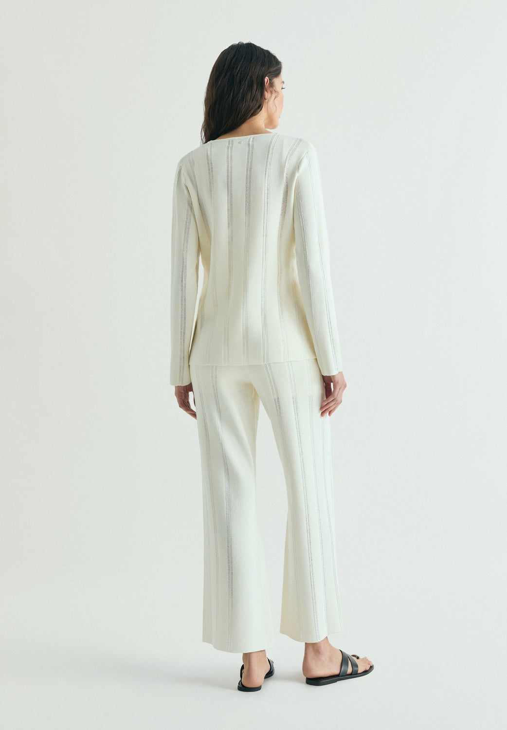 Recht, nauwsluitend vest. Gebreid vest met schuine details. V-hals met zichtbare centrale verticale knoopsluiting. Lange strakke mouwen. Effen rug.