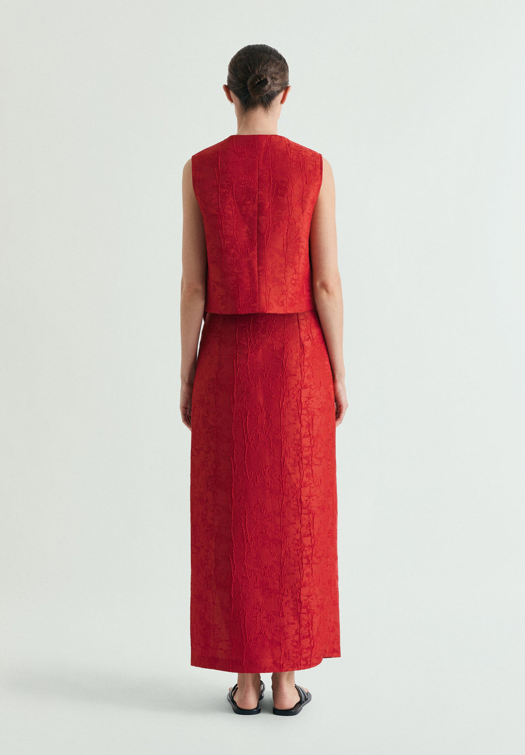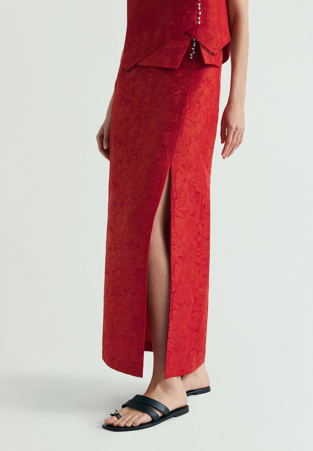 Skirt made of satin fabric with brocade print. Regular fit, midi length and front slit. Waist pleat detail with buttons and concealed side zip fastening.