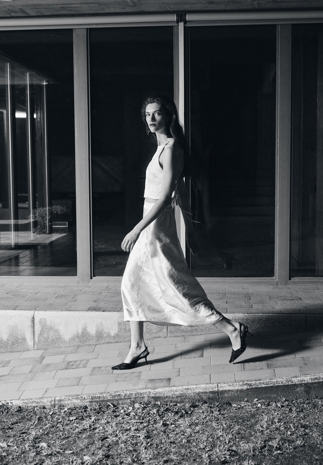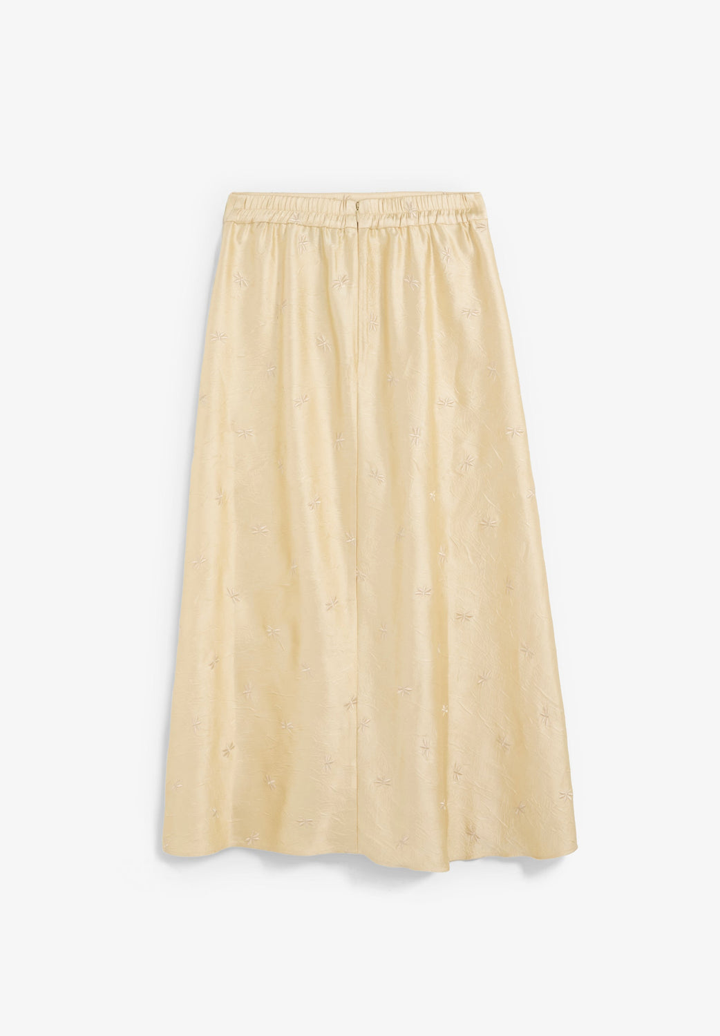 Midi skirt in satin fabric with tonal floral embroidery. Regular fit, flares out towards the hem. Mid to high waist. Invisible side zip fastening.