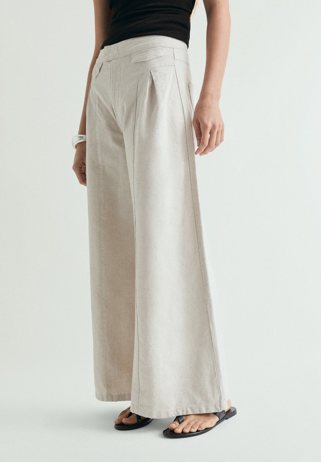 Jeans made of a cotton and rustic linen blend. Wide leg, high-rise. Waistband with concealed offset fastening and pockets with flap detail. Front darts. Patch pocket on the back.