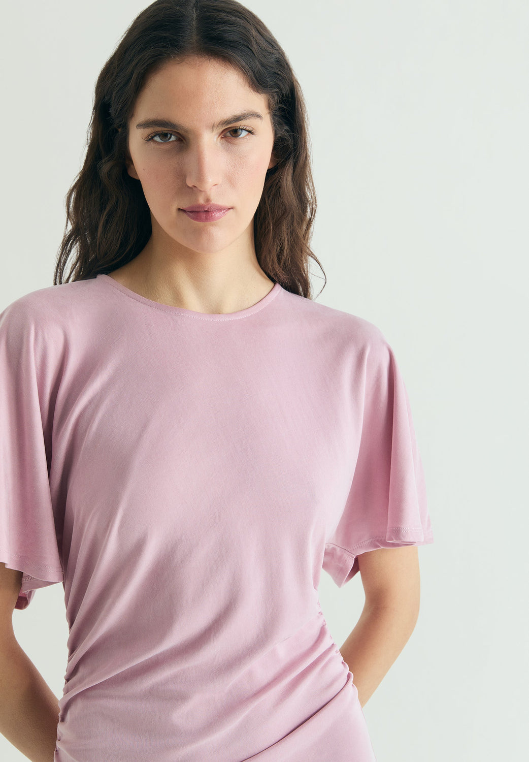 Dress made of cupro fabric. Slim fit, round neck and short sleeves with ruffle. Gathered detailing on waistband. Midi length.