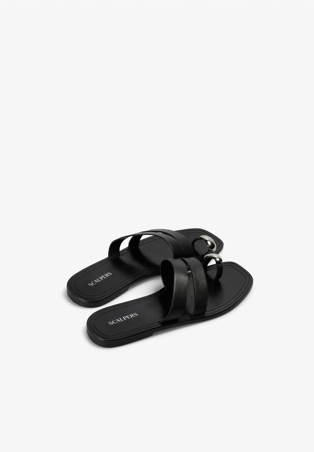 100% leather flat sandal with straps. Metal trim detail on the toe.