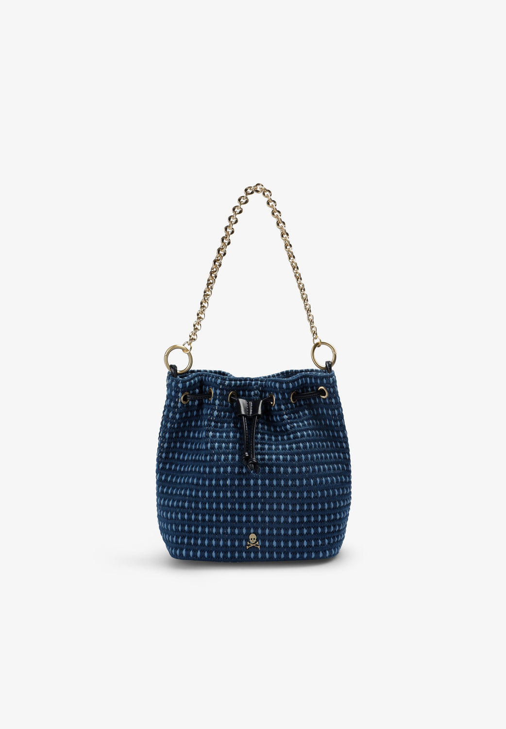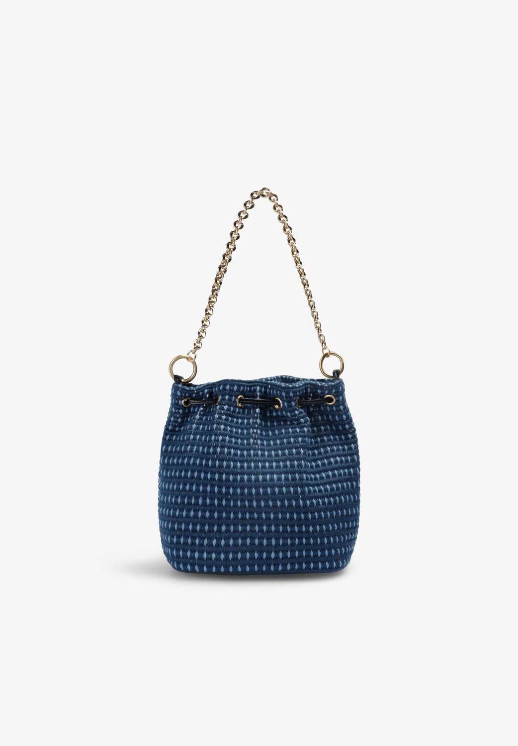 Bag made of a braided cotton and PU blend. Interchangeable handle with chain. Adjustable drawstring fastening. Inner lining with zipped pocket.