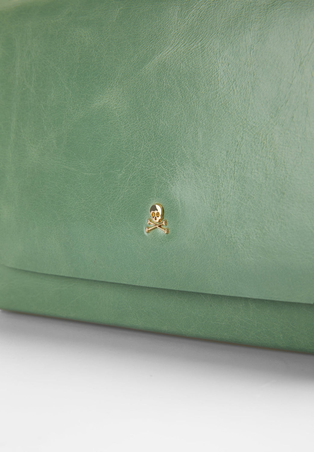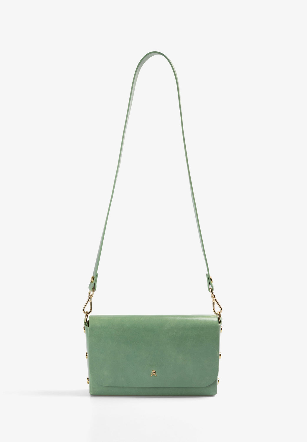 Small flat bag. Made of 100% leather. Snap closure. Long detachable strap and short handle. Side studs.