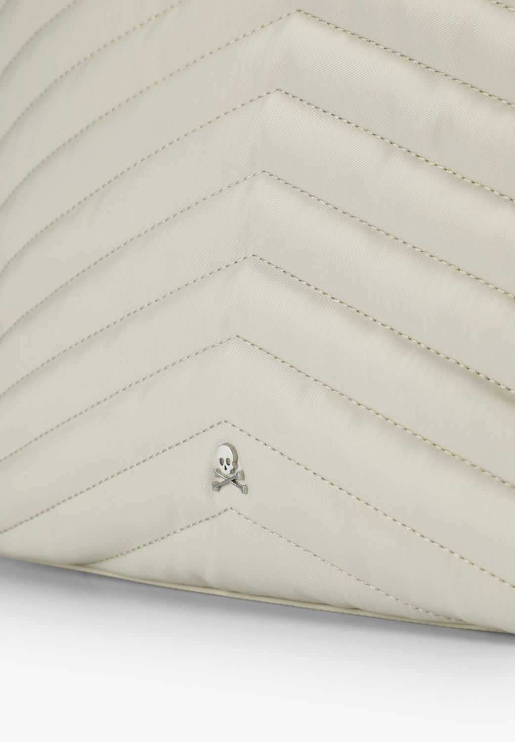 Quilted nylon tote bag. Double straps and zip fastening. Double inner pocket, one with zip. Metal skull on the front.