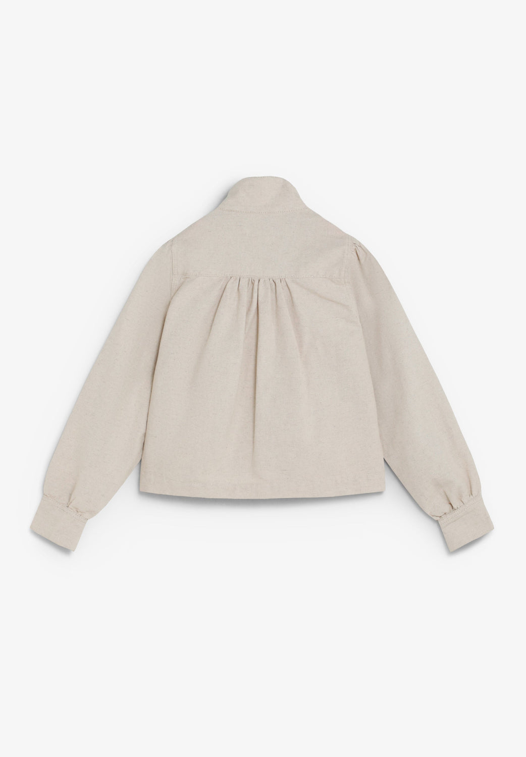 Denim jacket made of a cotton and rustic linen blend. Relaxed fit. Stand-up collar and puff sleeves with cuffs. Front patch pocket. Concealed button fastening. Gathered back yoke. Matching topstitching detail.