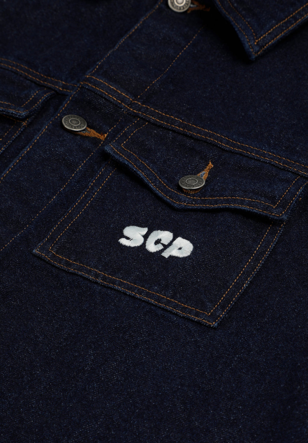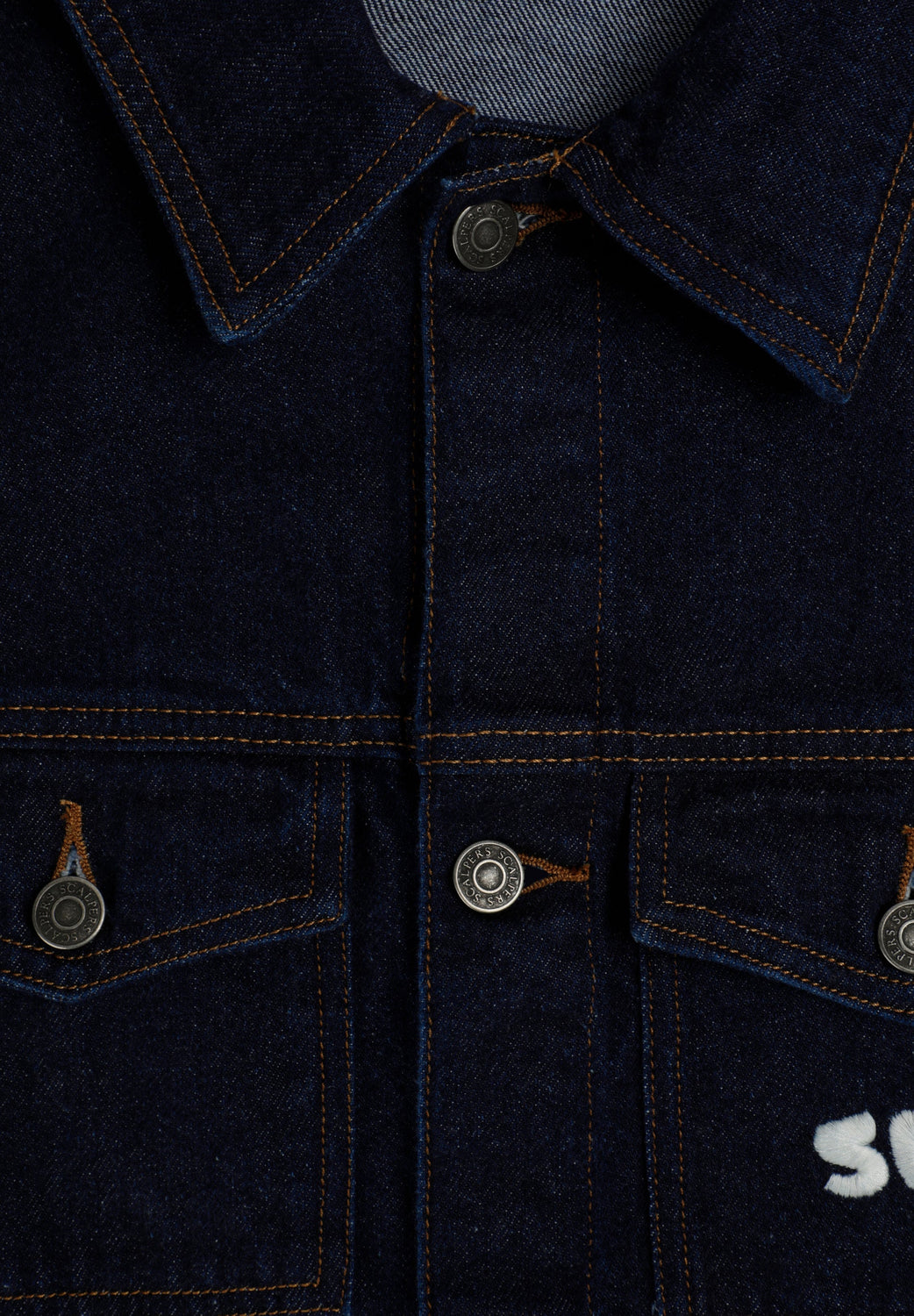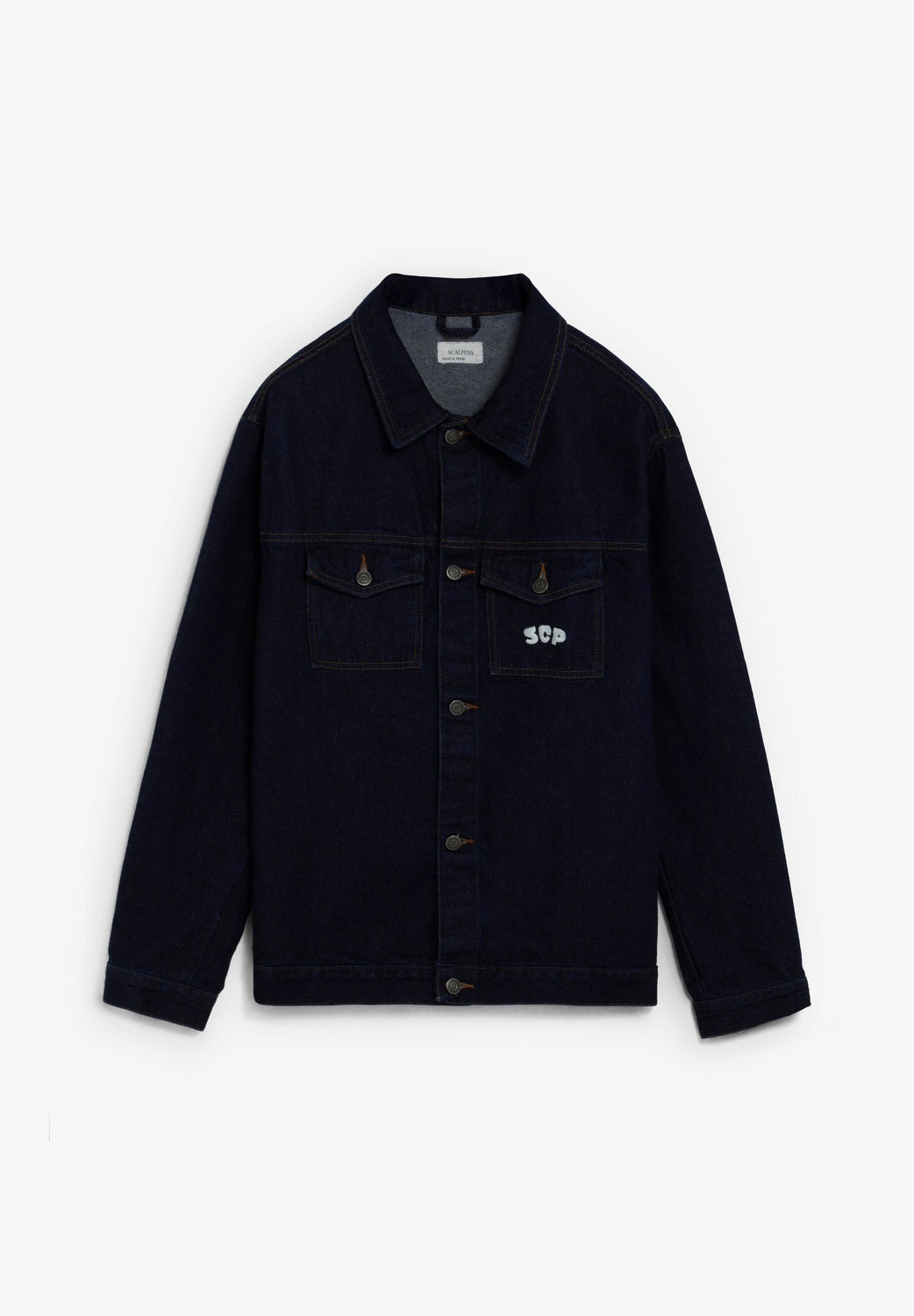 Denim jacket made of 100% cotton. Lapel collar and long sleeves with buttoned cuffs. Buttoned chest pocket with embroidered logo detail. High-density printing on the back. Button fastening. Made in Spain.