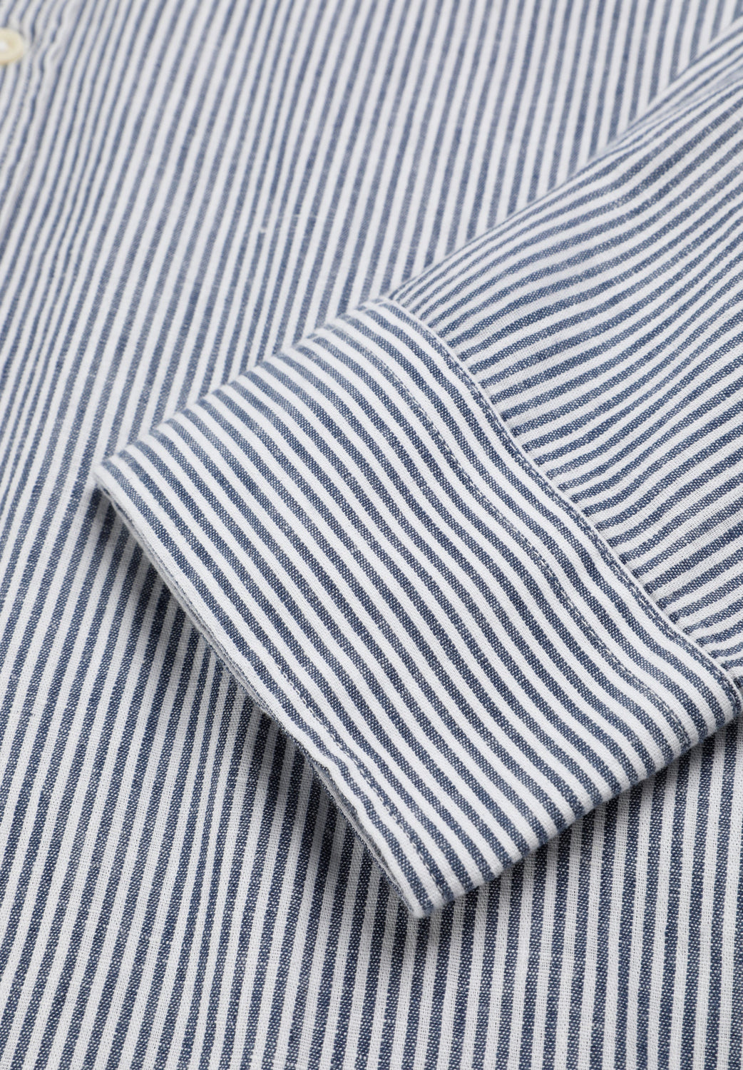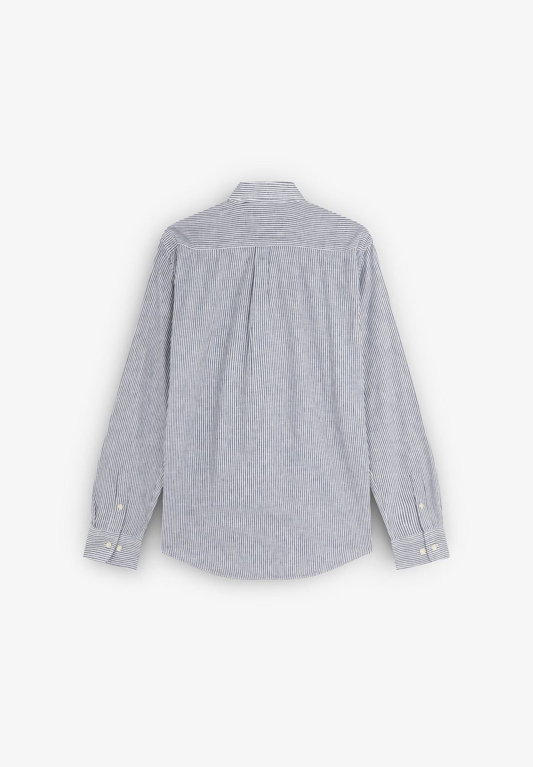 Shirt made of linen fabric. Shirt collar with button fastening. Long adjustable sleeves. Front button fastening. Stripe print. Embroidered logo.