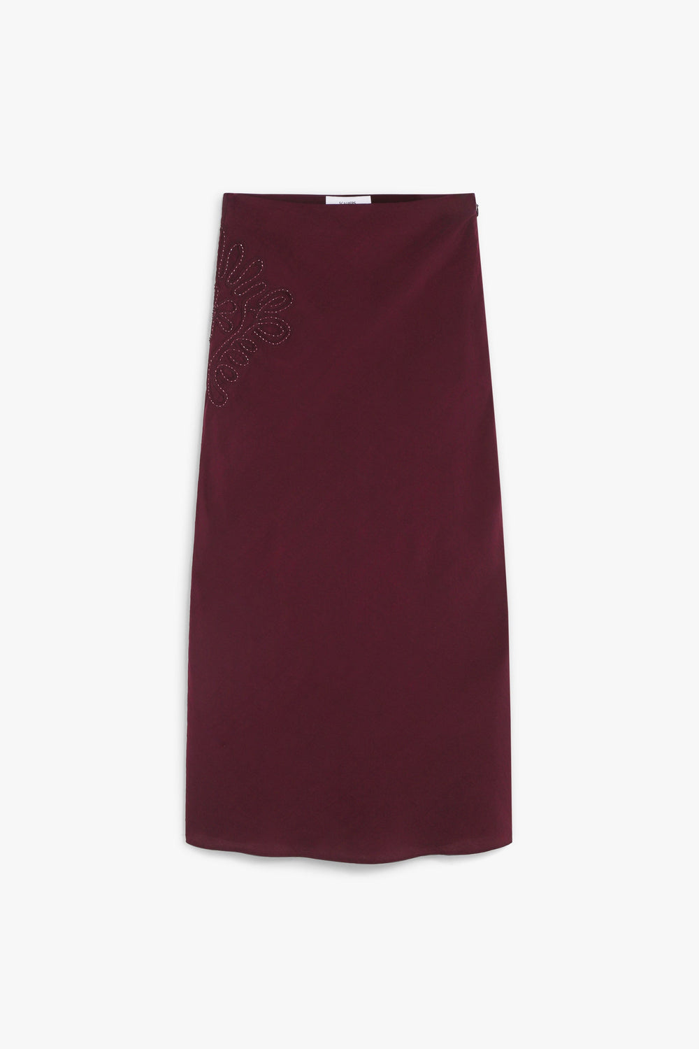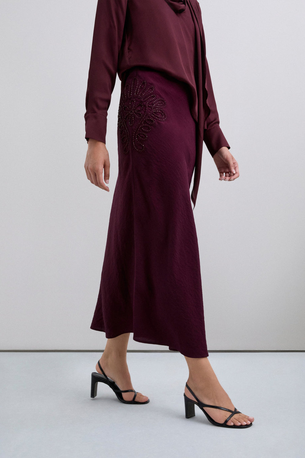 Bias cut skirt. Mid-rise. Fluid fabric. Invisible zip fastening.