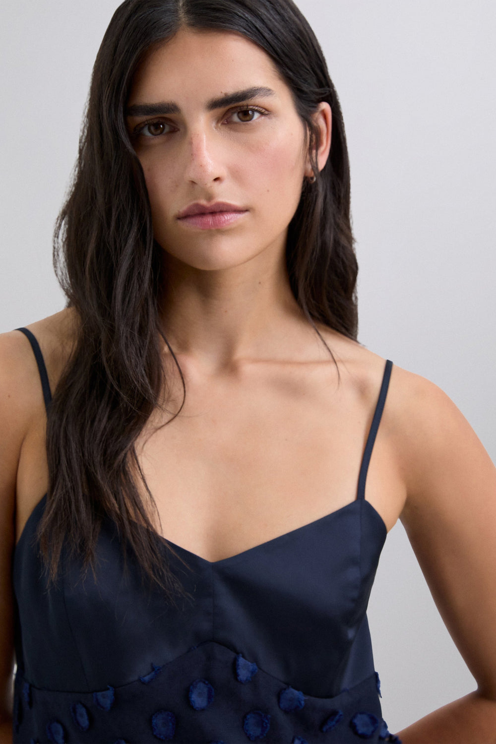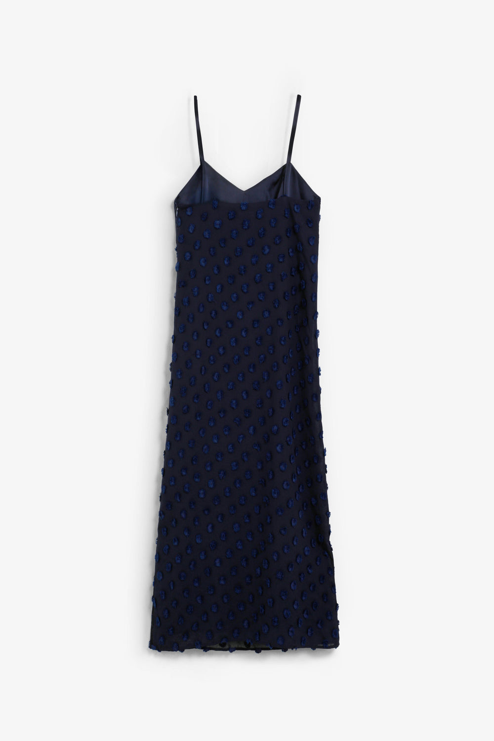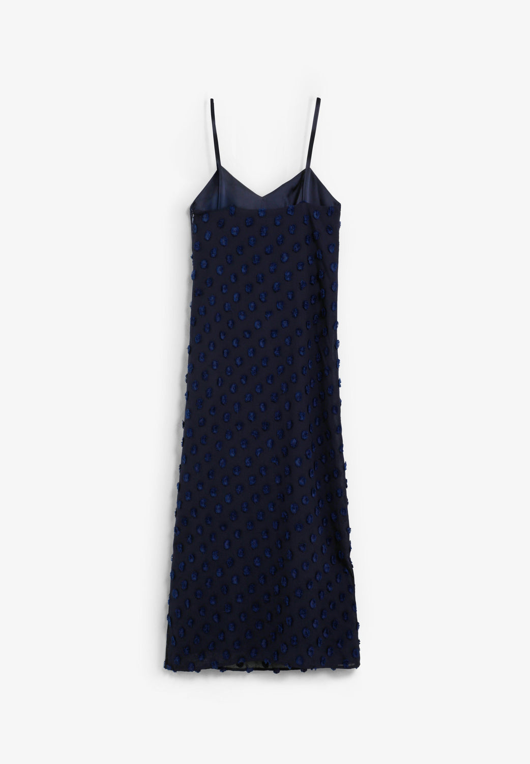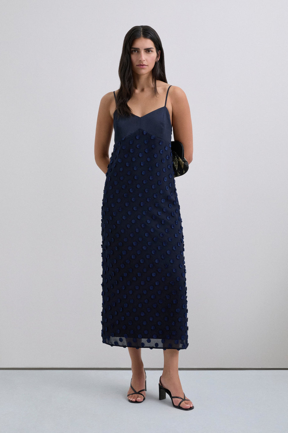 Midi dress in jacquard fabric with a polka dot print. Satin-finish bodice piece. With straps. Side zip fastening.