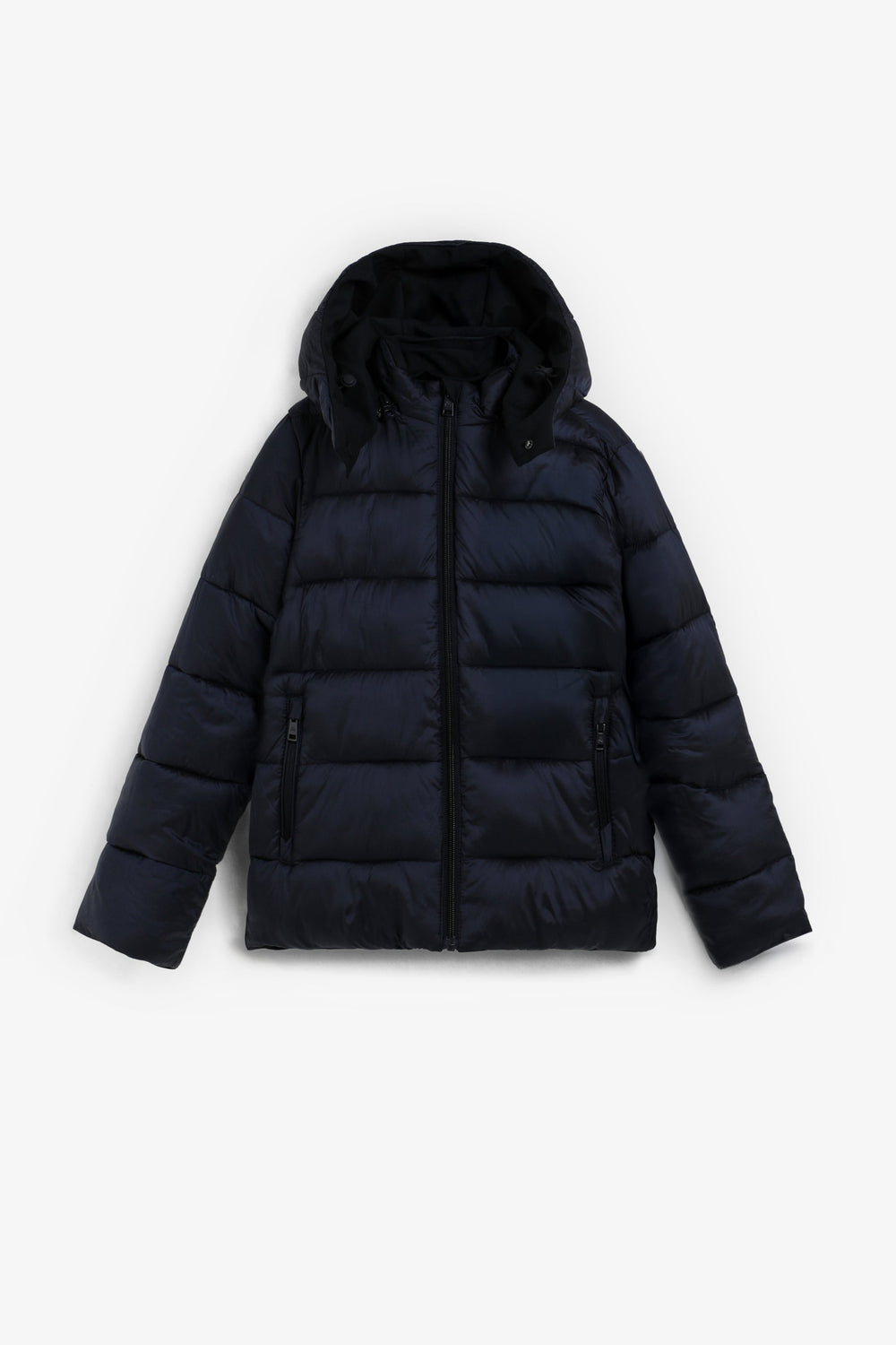 Jacket with detachable hood with button fastening. Long sleeves. Double slider thermo-sealed zip. Two front pockets. Rubber logo patch detail and skull on the sleeve.