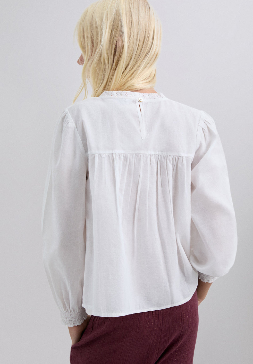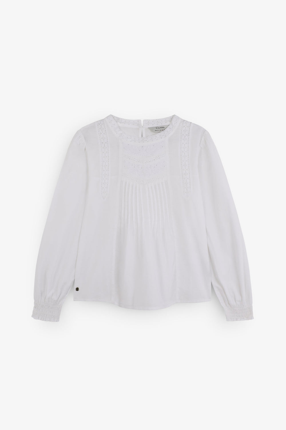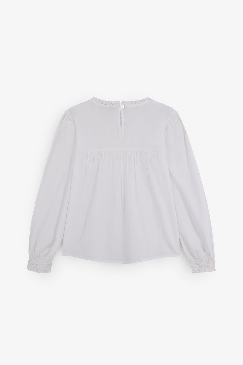 Blouse made of 100% BCI cotton. Regular fit. Round neck. Long puff sleeves with elastic trim. Metallic logo detail on waistband. Embroidered details on collar and front. Back button fastening.