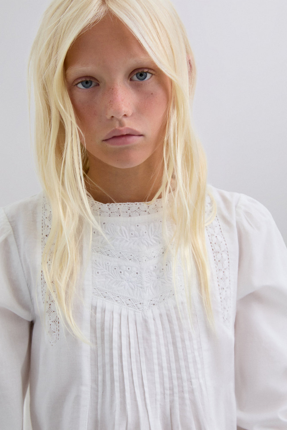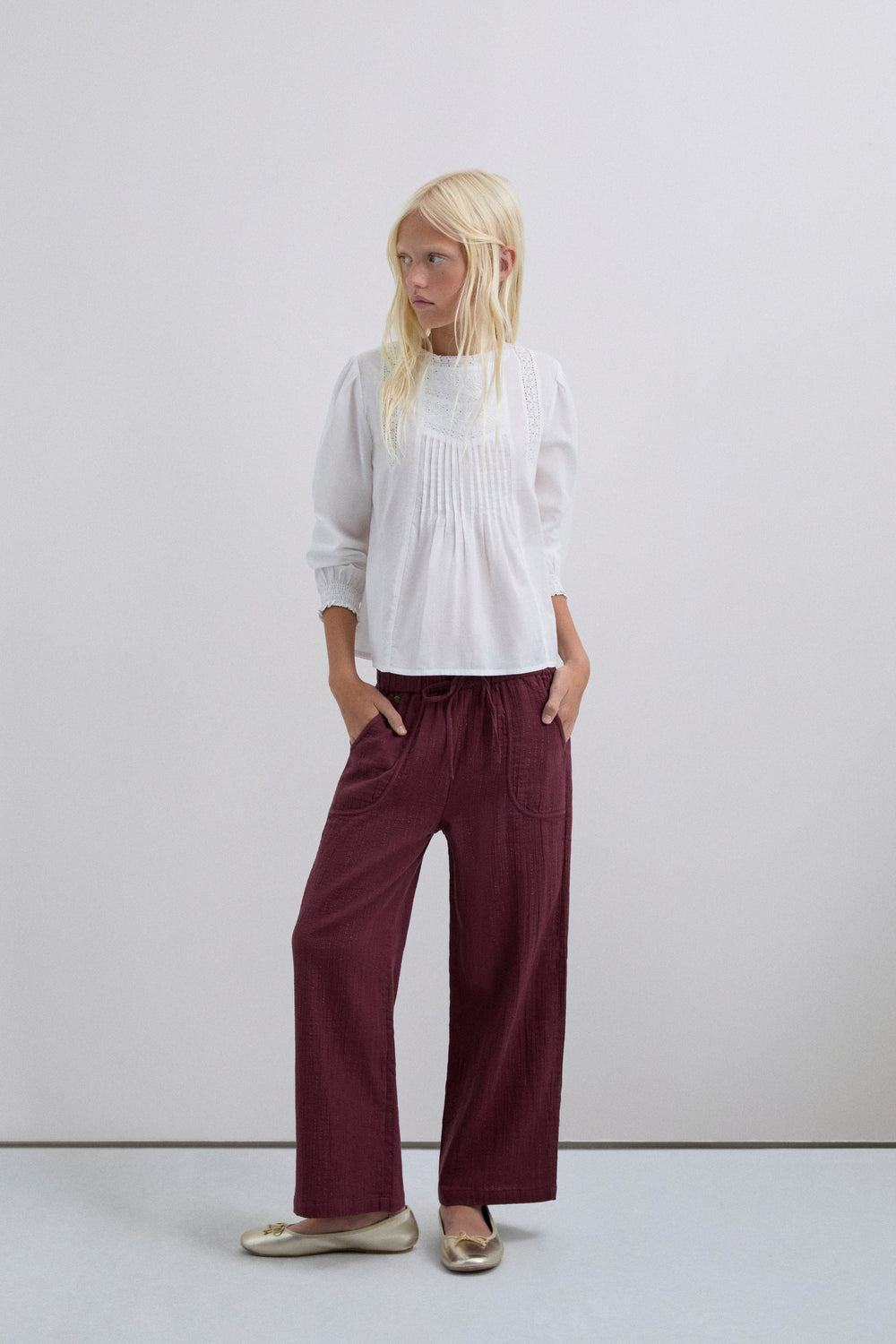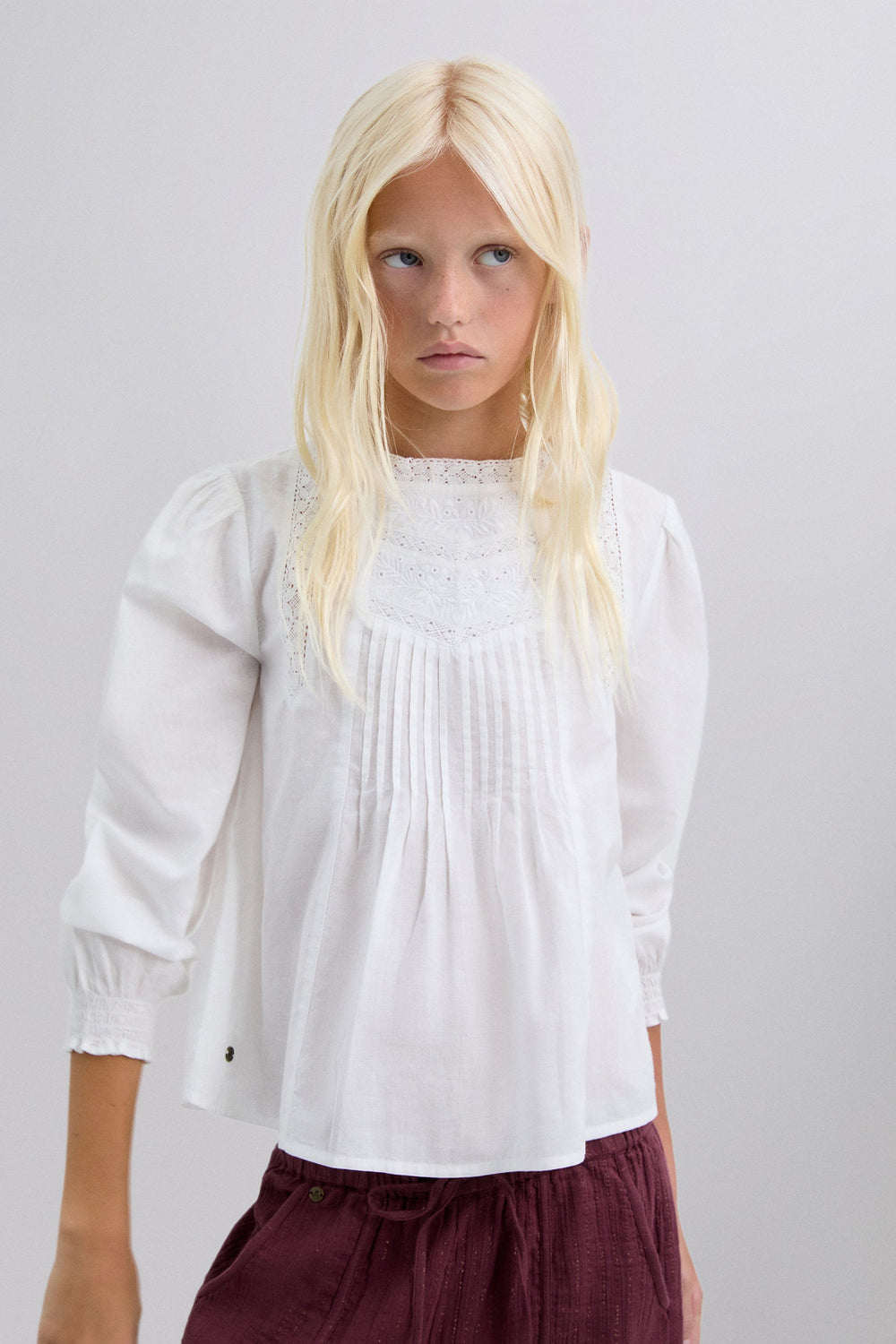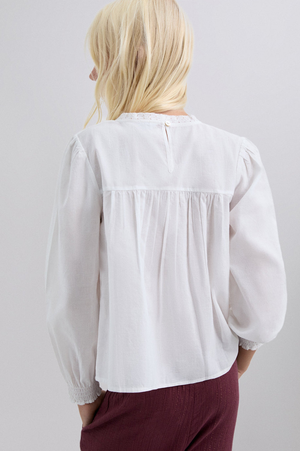 Blouse made of 100% BCI cotton. Regular fit. Round neck. Long puff sleeves with elastic trim. Metallic logo detail on waistband. Embroidered details on collar and front. Back button fastening.
