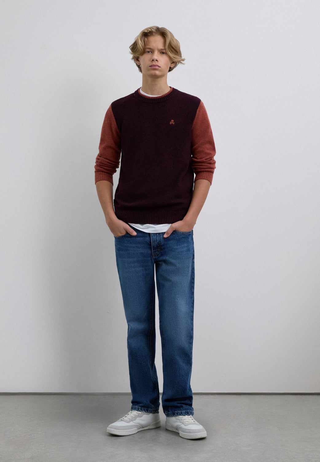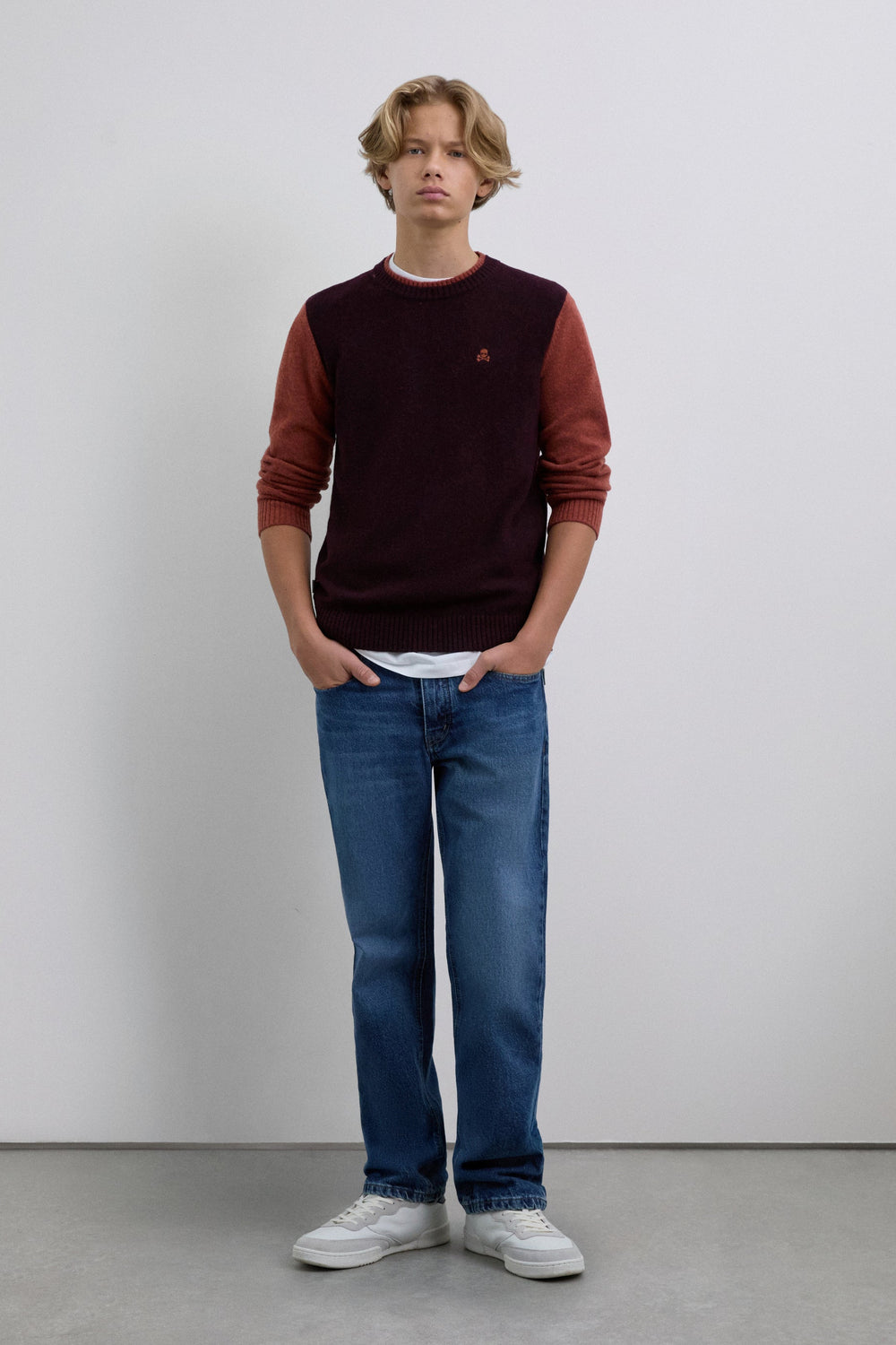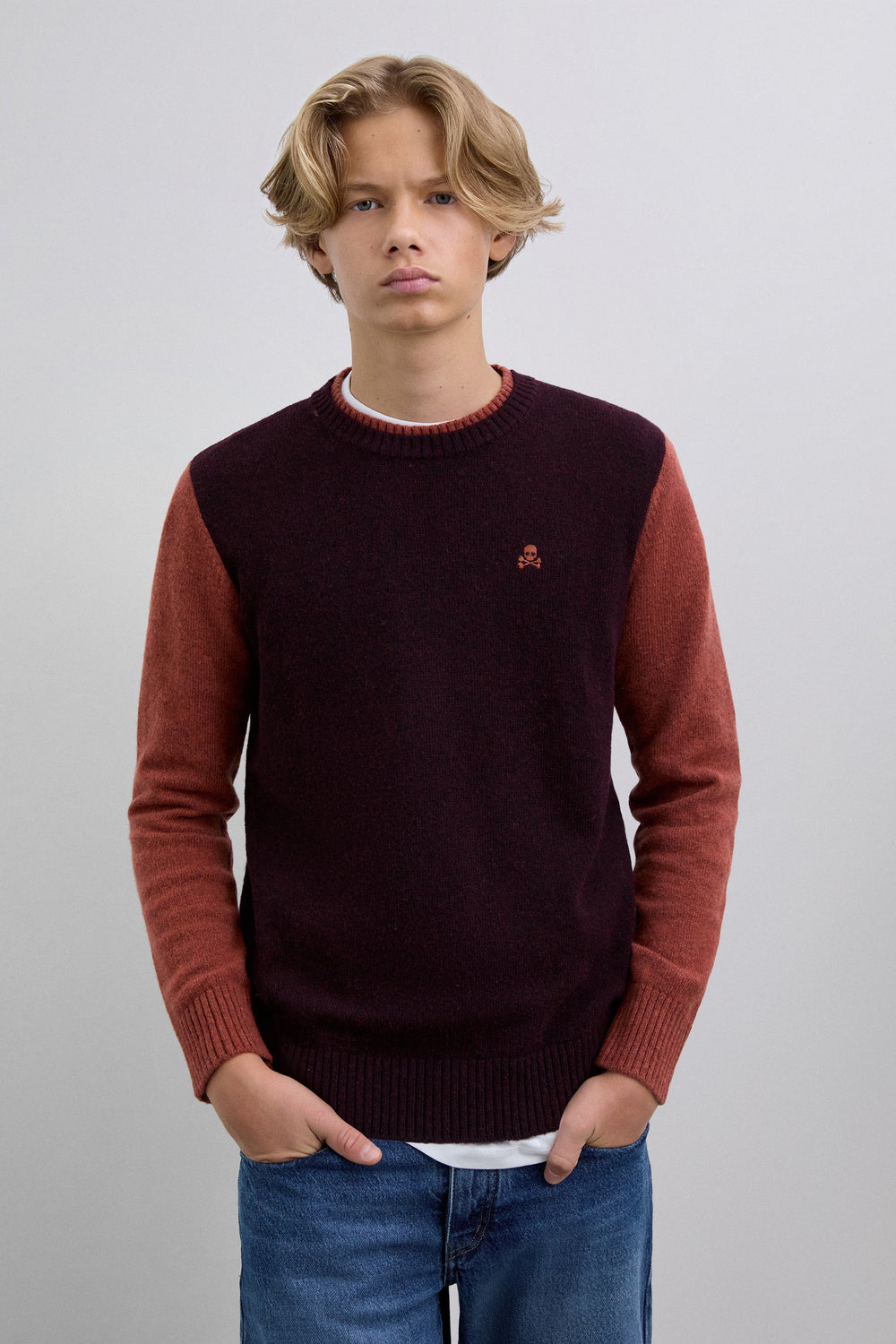 Knit sweater made of a wool blend. Round neck and contrasting long sleeves. Contrast embroidered logo detail on the chest.