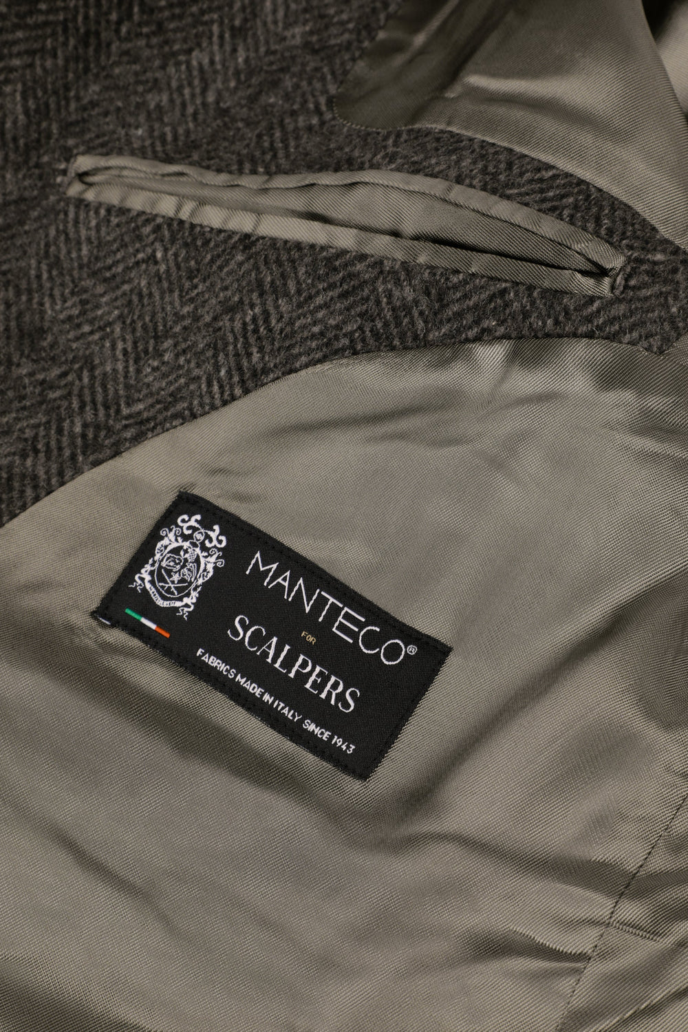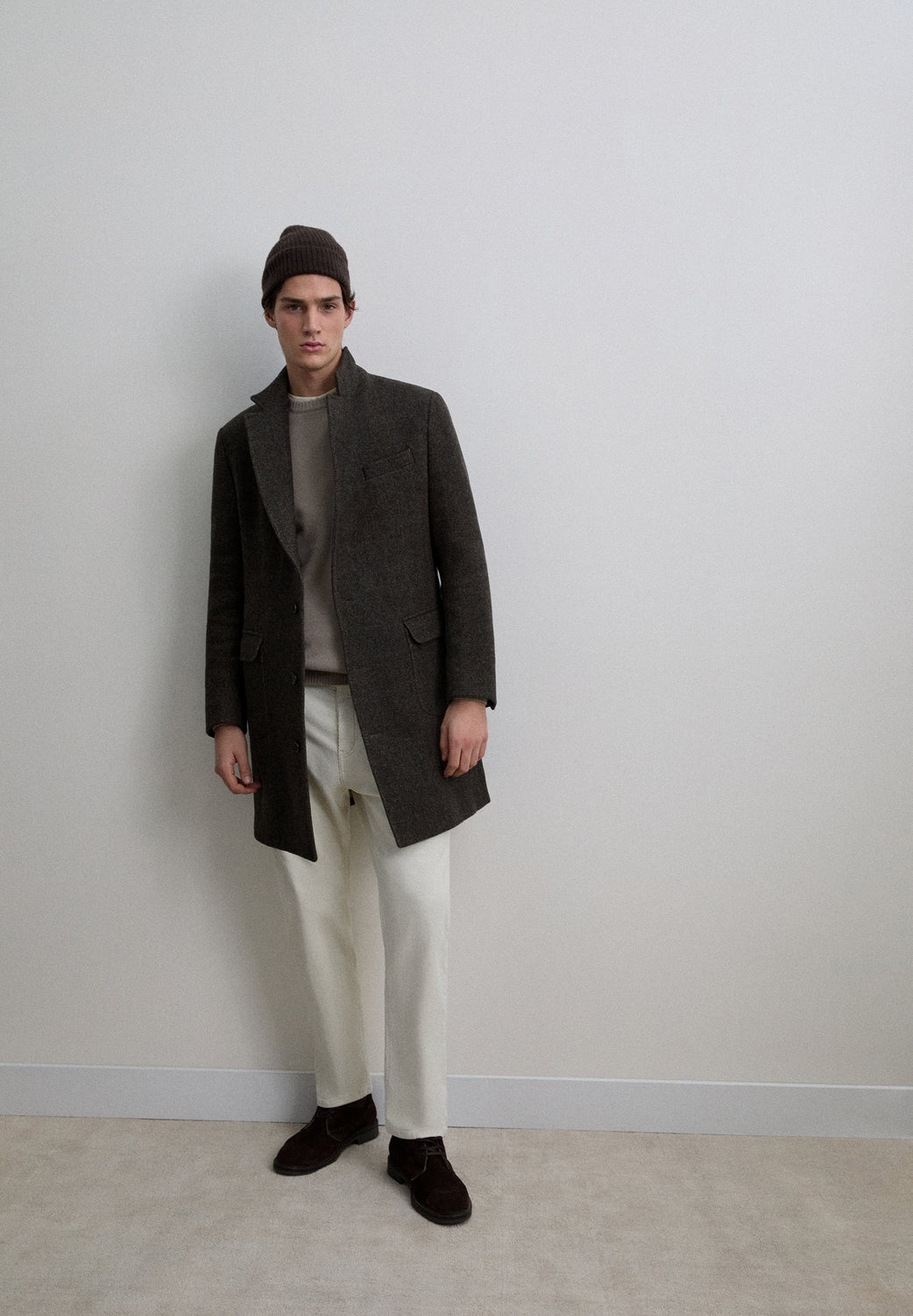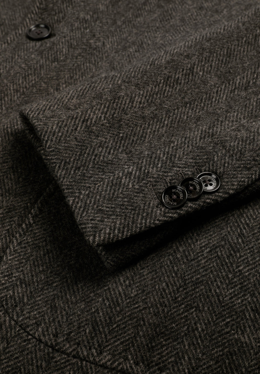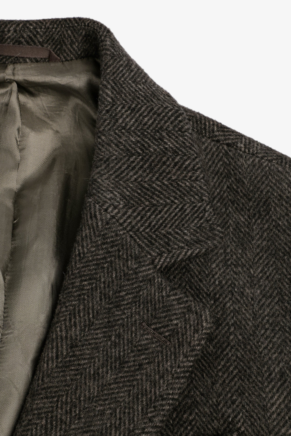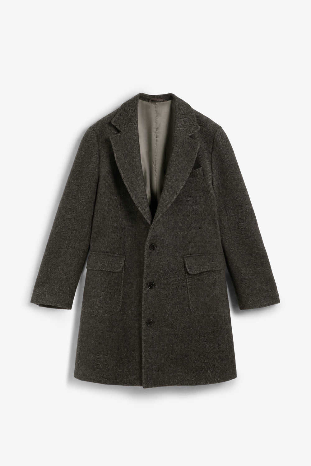 Jas van stof met visgraatmotief in bruintinten. Reverskraag. Dubbele klepzakken, knoopsluiting voor. Geborsteld effect.