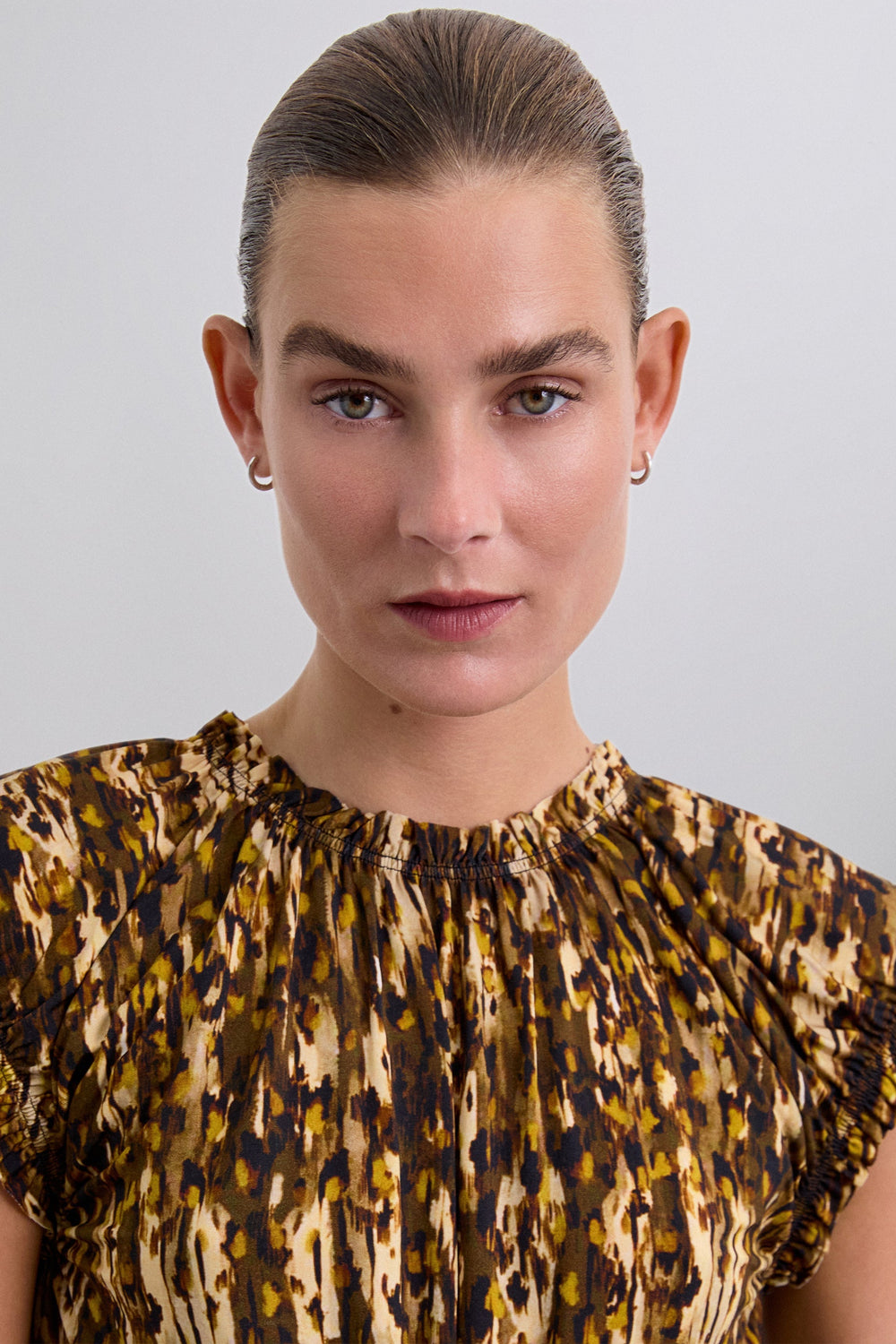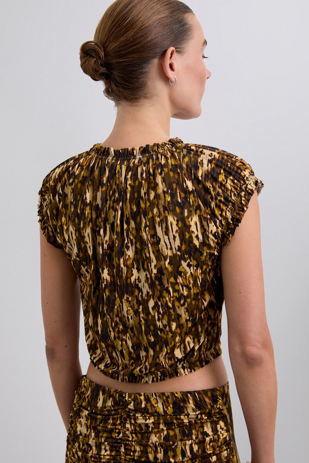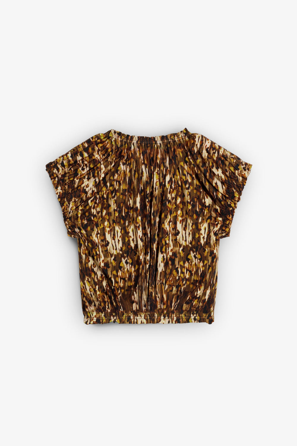 Printed top with metal buckle detail on the front. Short sleeve. Round neck.