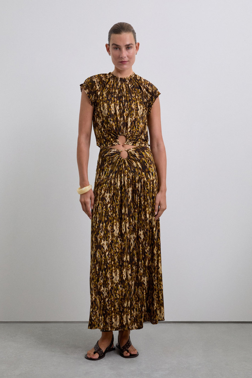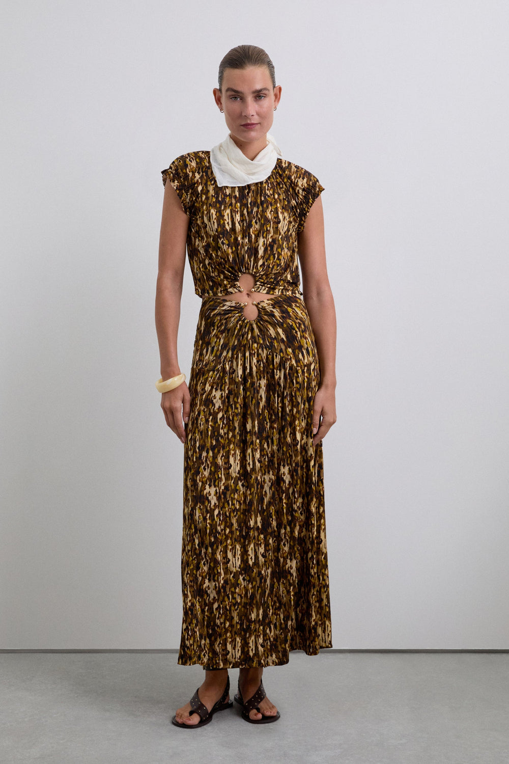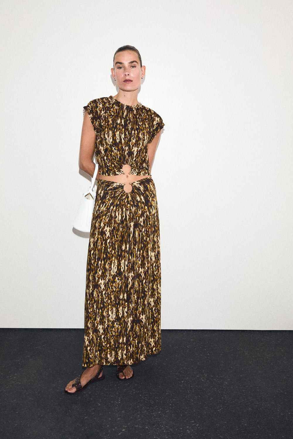 Printed top with metal buckle detail on the front. Short sleeve. Round neck.