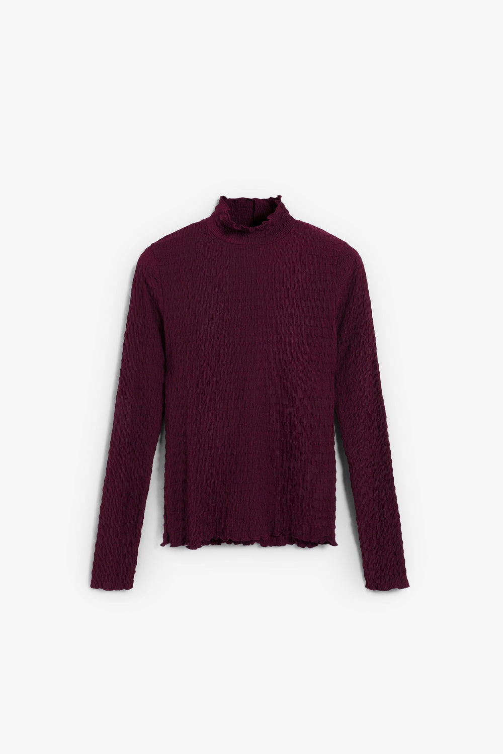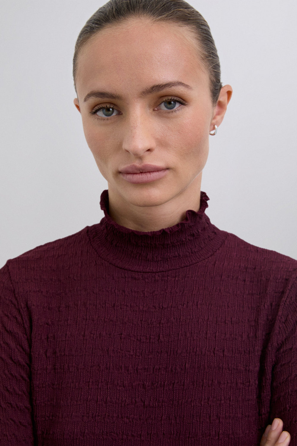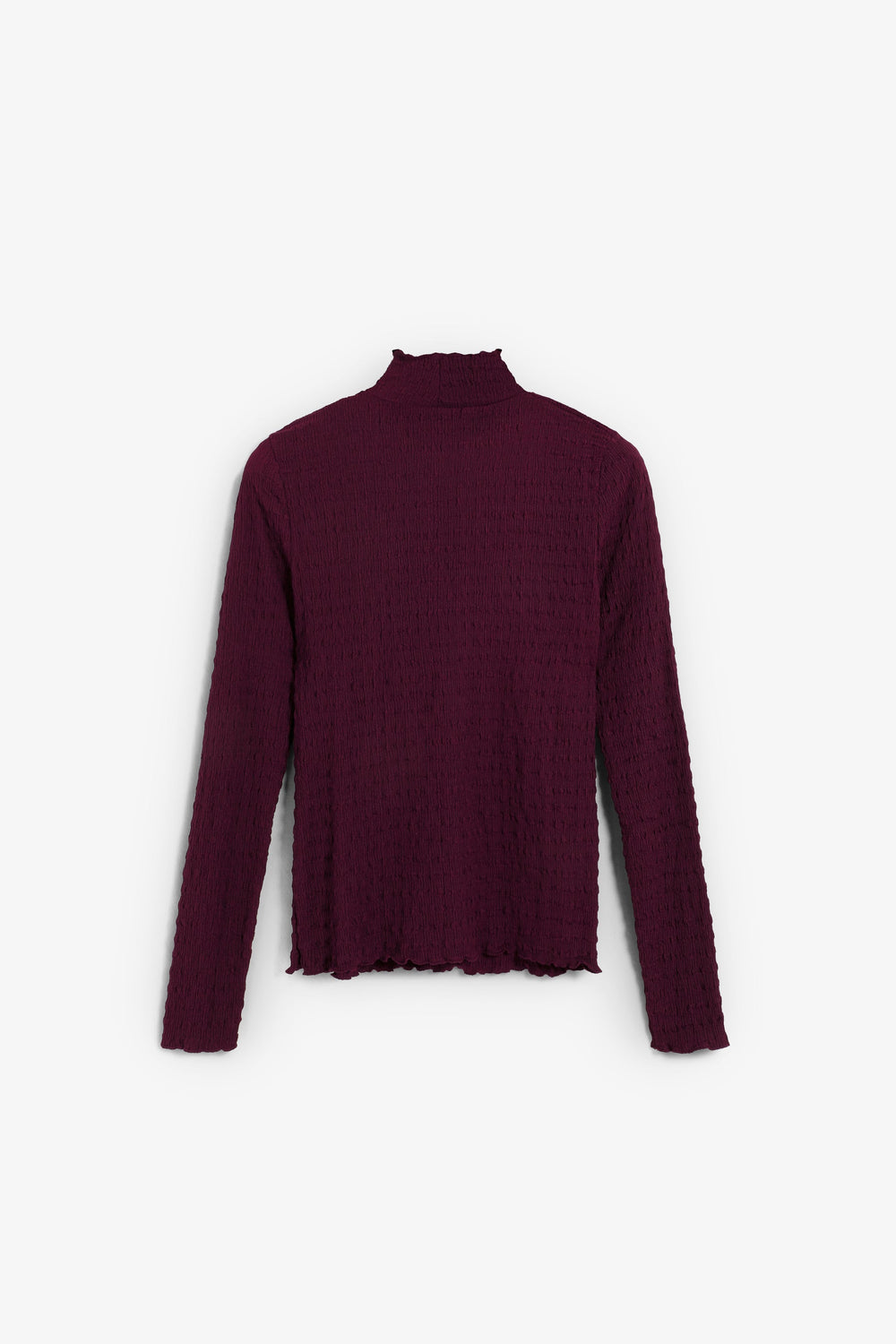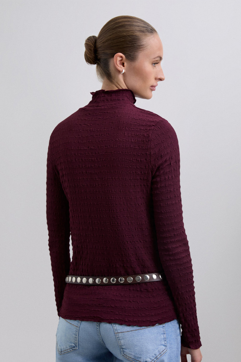 High neck top with long sleeves. Lightweight fabric with gathered texture.