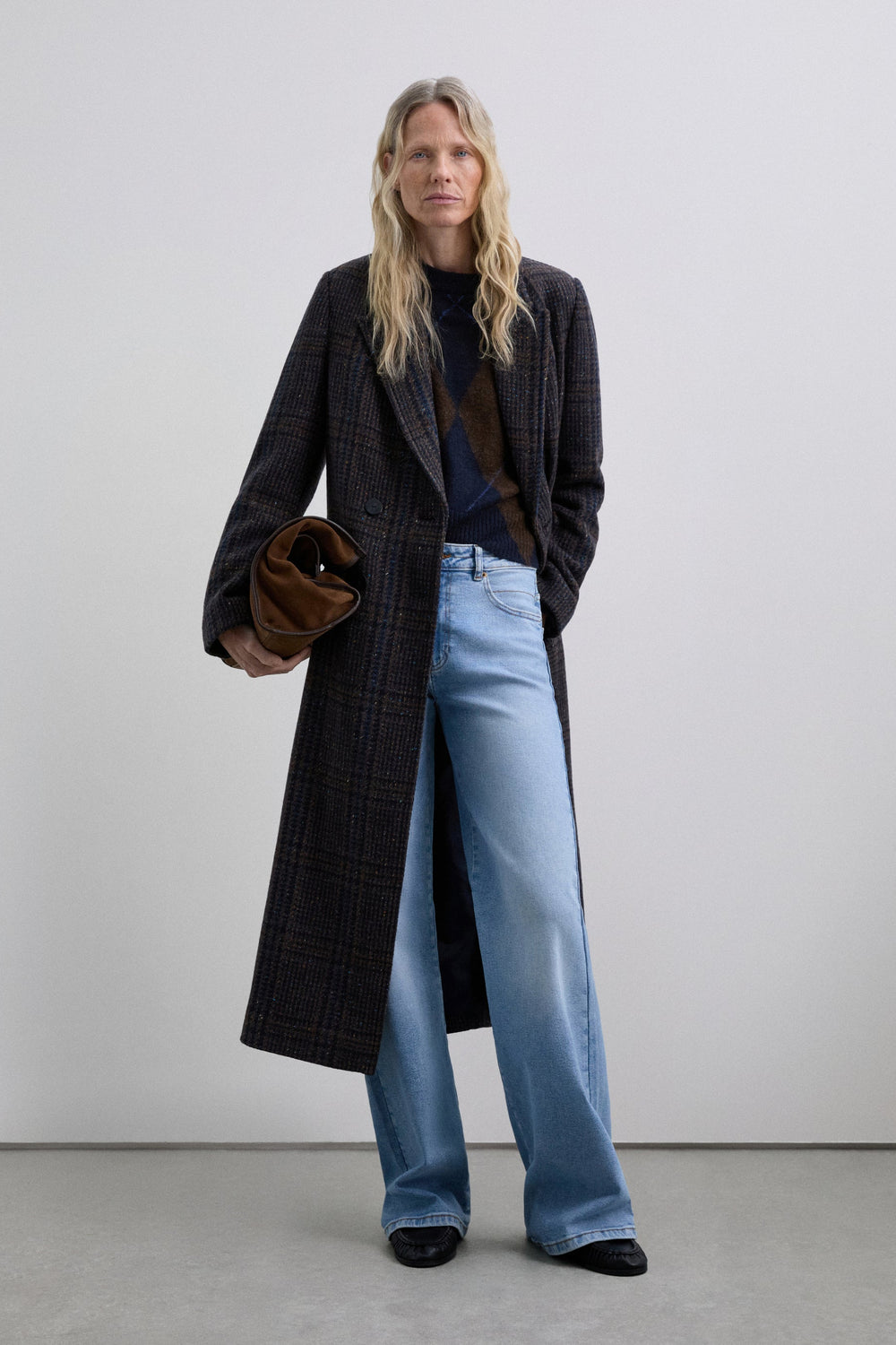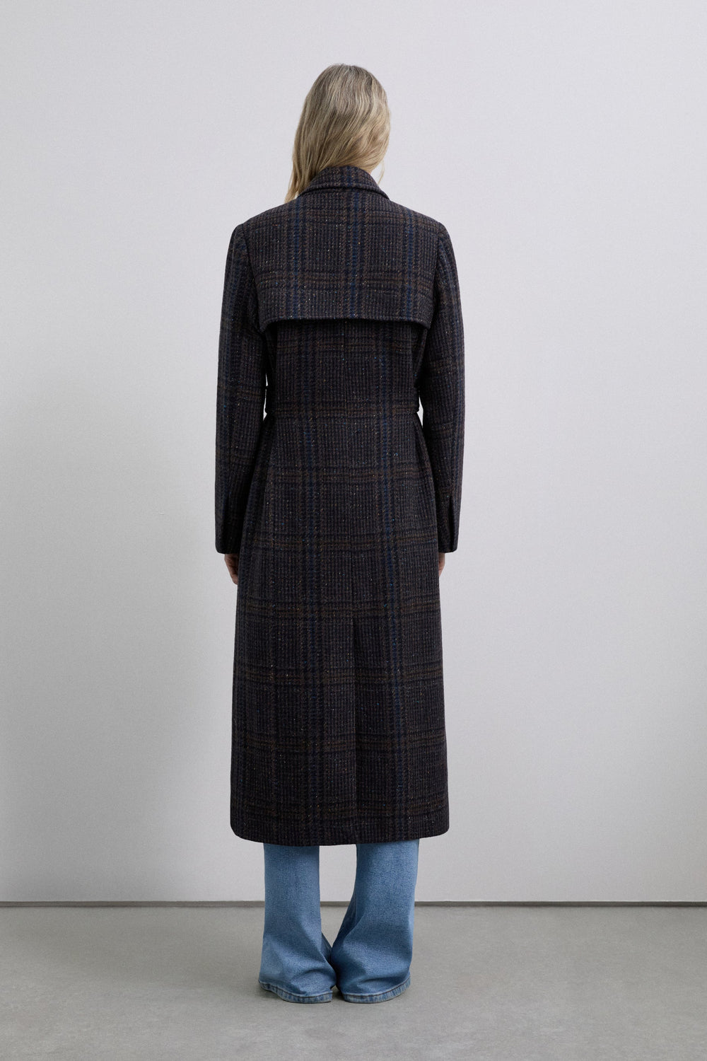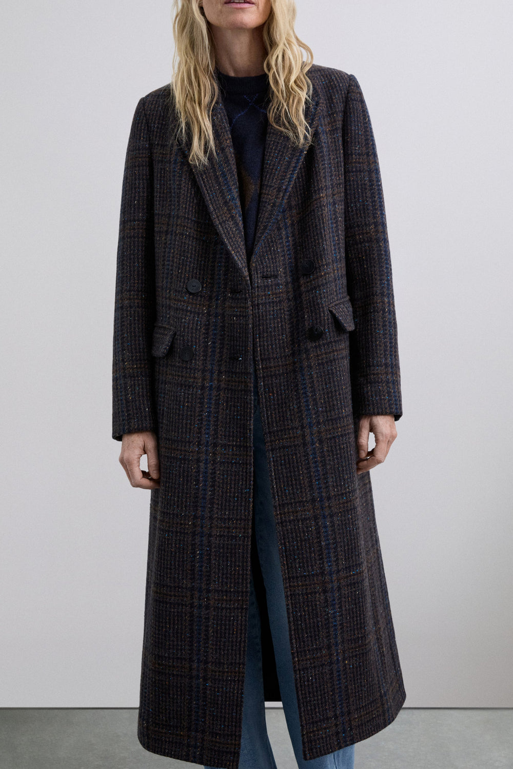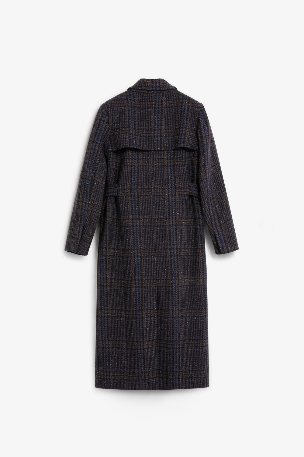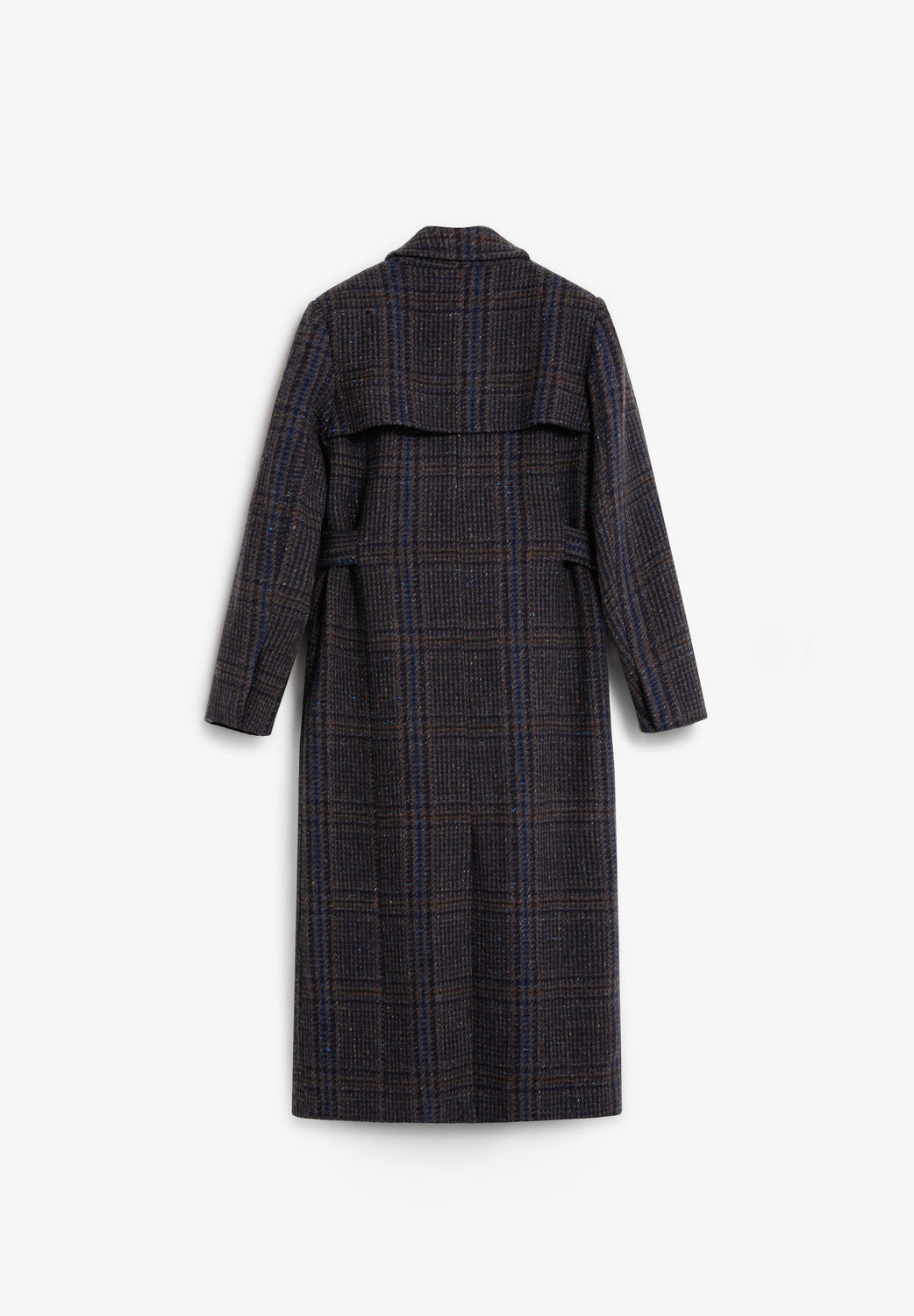Long wool coat with subtle check pattern. Features shoulder pads, straight cut and classic lapels. Front button fastening and matching belt to adjust the waist. Side pockets.