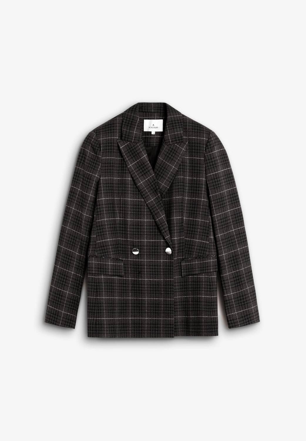 Blazer with pointed lapel. Long sleeves. Double-breasted front button fastening. Two welt pockets. Check print.