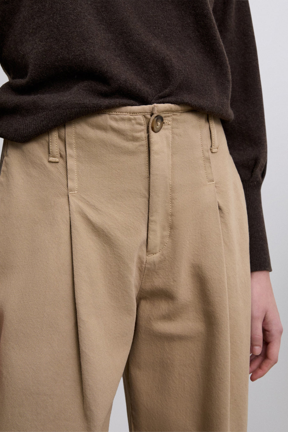 Trousers made of 100% cotton. Wide-leg trousers, designed with a wide, loose-fit from hip to ankle. Button and zip fastening. Belt loops.