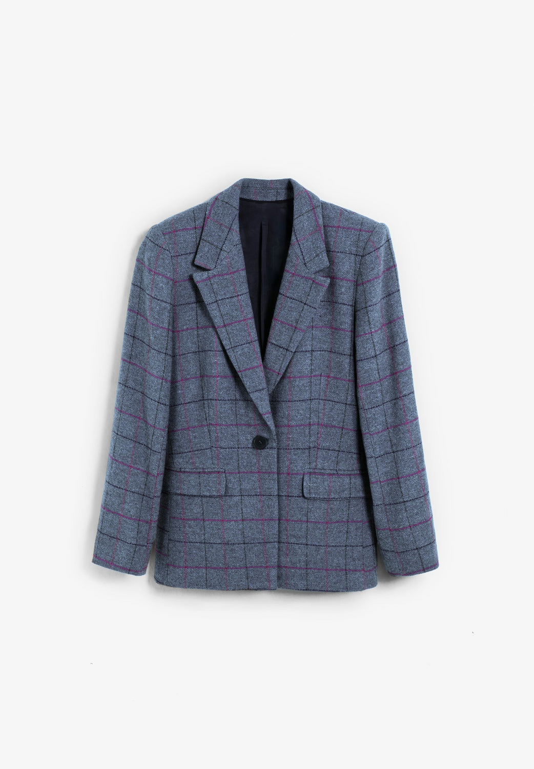 Blazer made of wool. Check print. Textured shoulder pads. Front button fastening. Two back pockets with flaps.