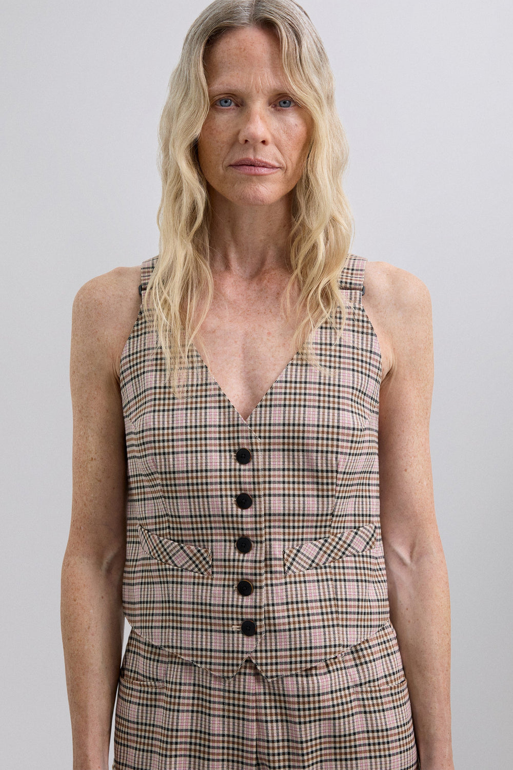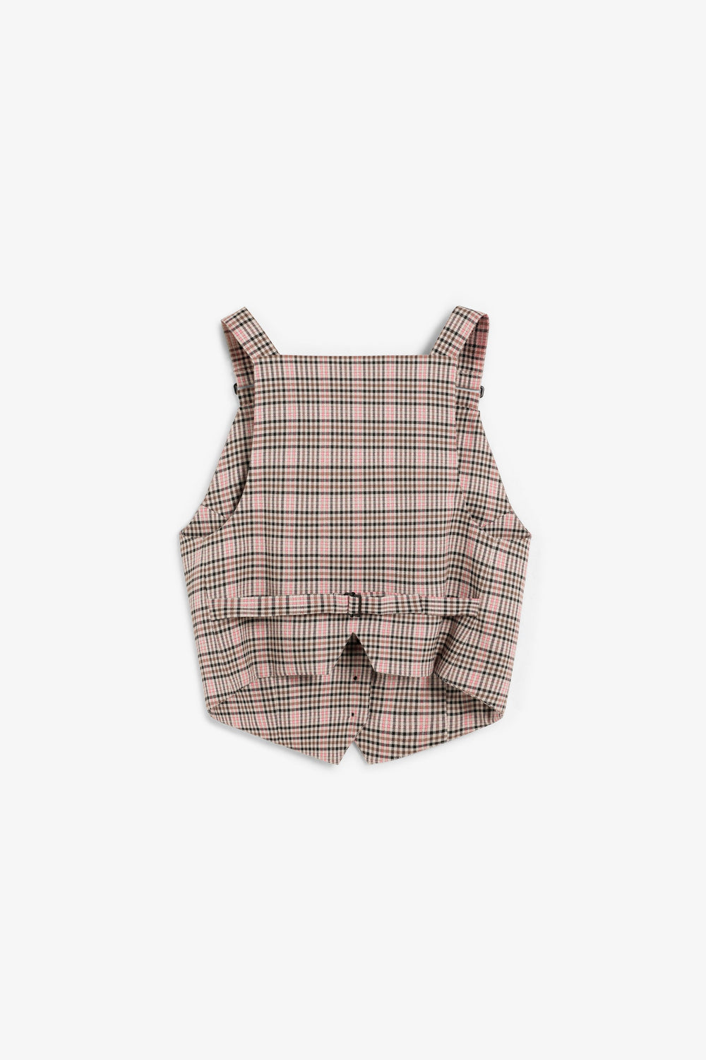 Coat with check print. V-neckline. Multipurpose straps. Front button fastening. Two front pockets.