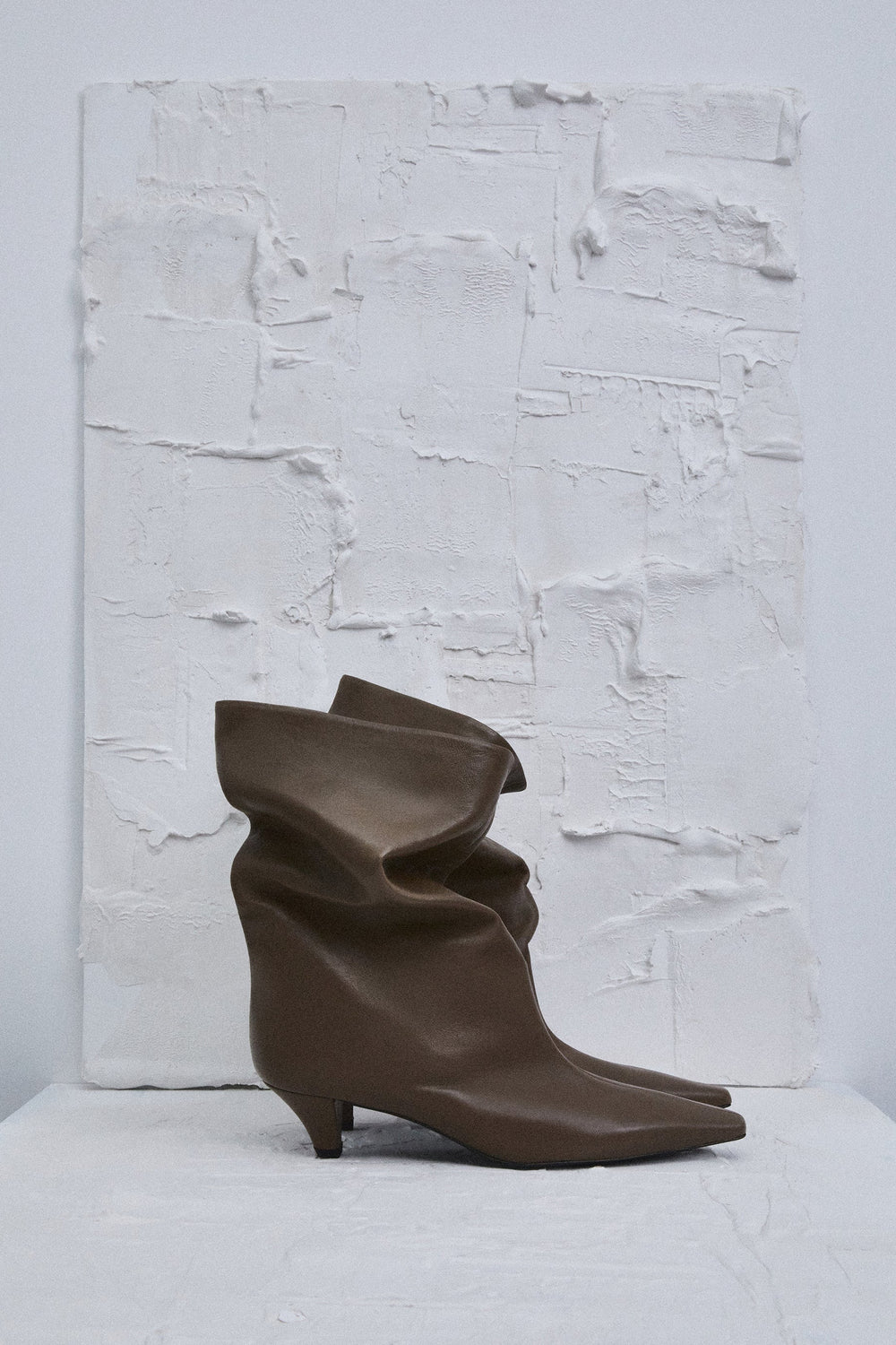Boots made of 100% leather. Gathered leg detail. Medium Kitten heel. Pointed finish.