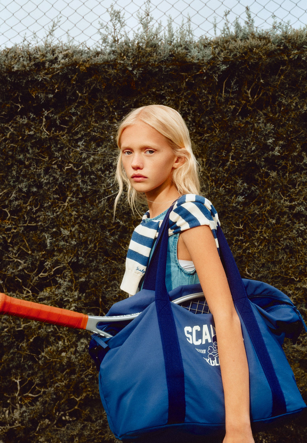 Bag made of fabric. Side print. Double strap. Zip closure. Side and inside pockets.