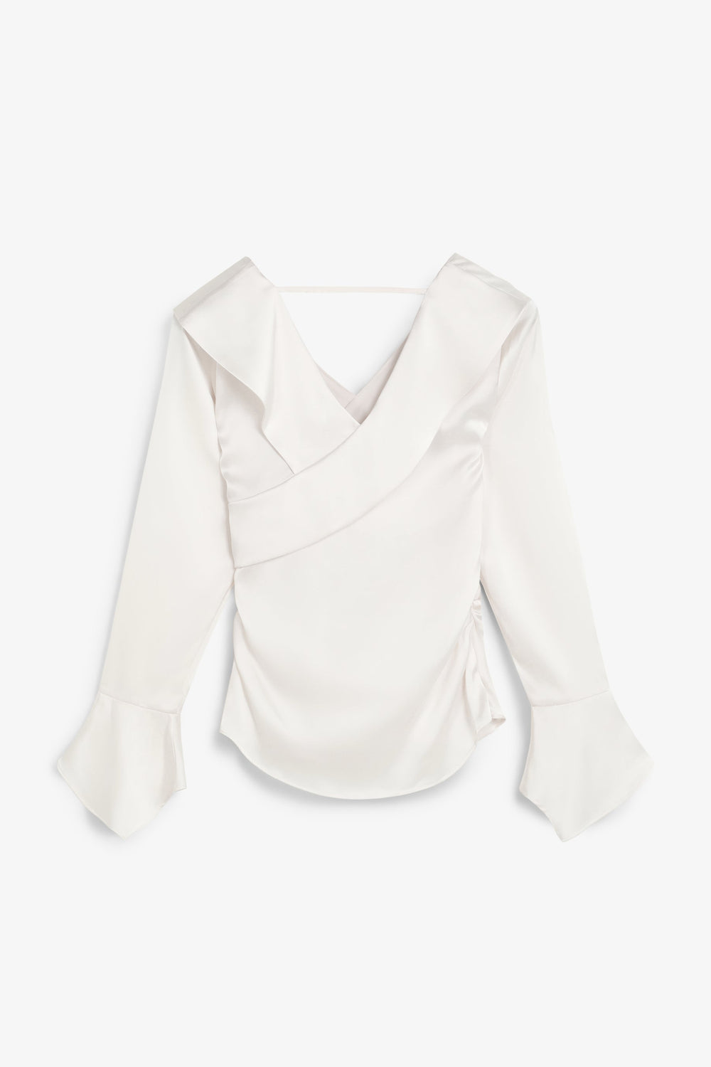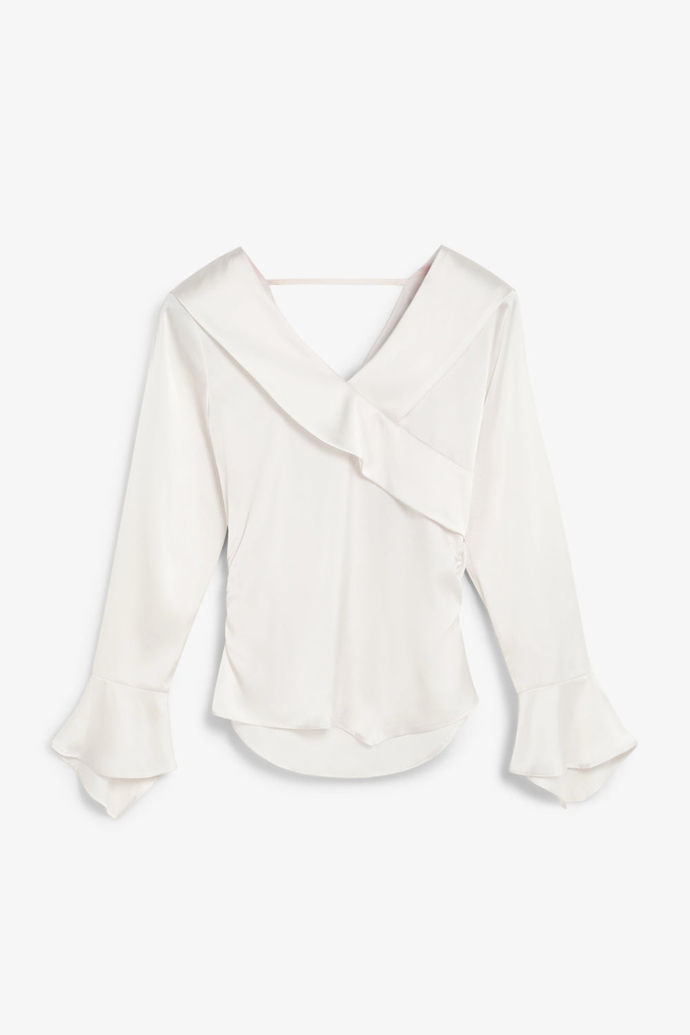 Asymmetrische blouse met lange mouwen en ruches. Geplooide taille en V-hals met ruches.