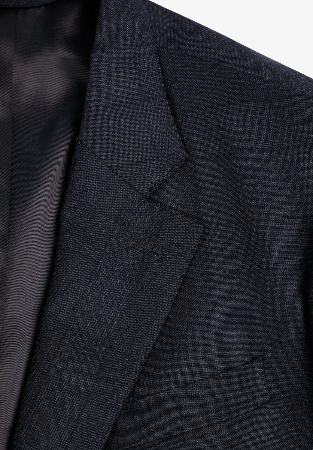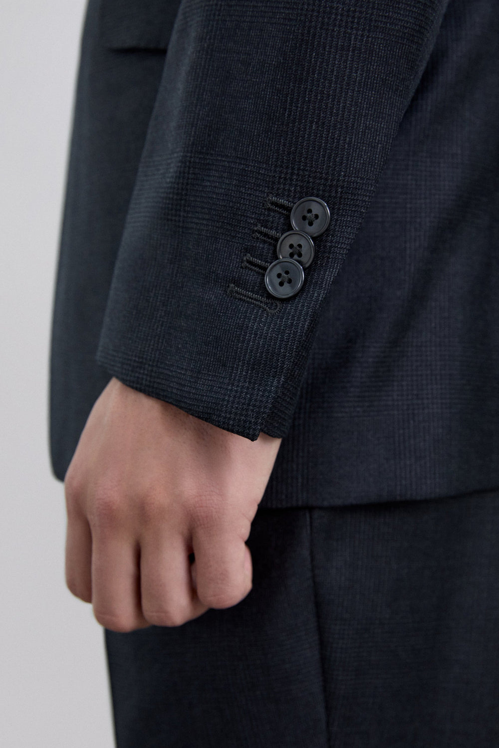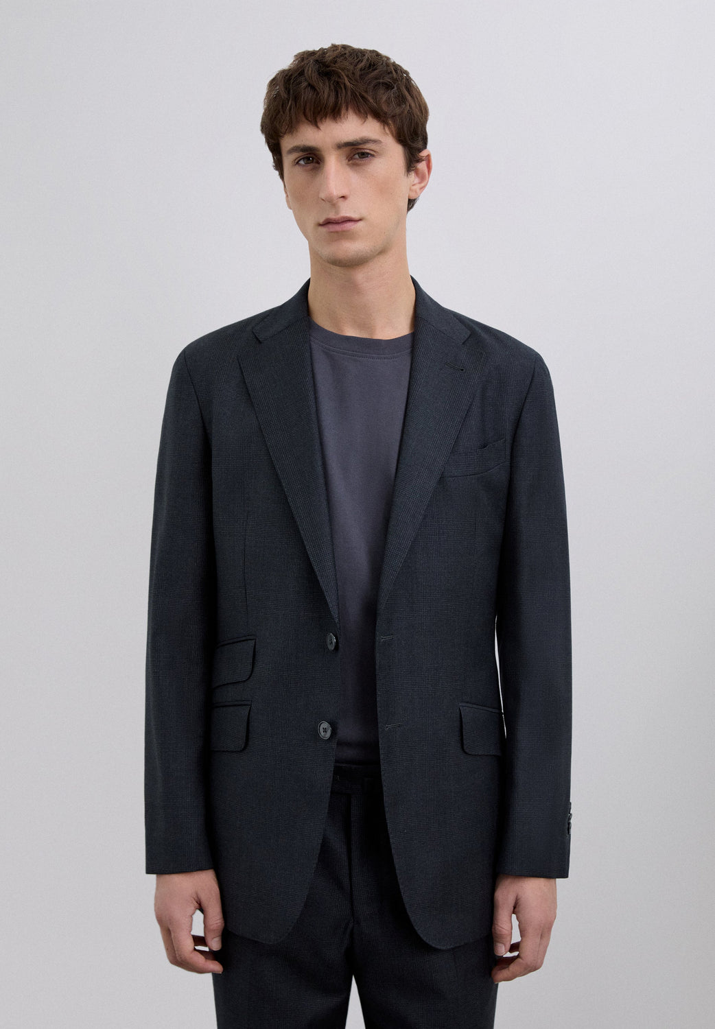 Blazer made of 100% wool. Regular lapels. Chest pocket with piping. Three slanted flap pockets. Two button fastening at the front.