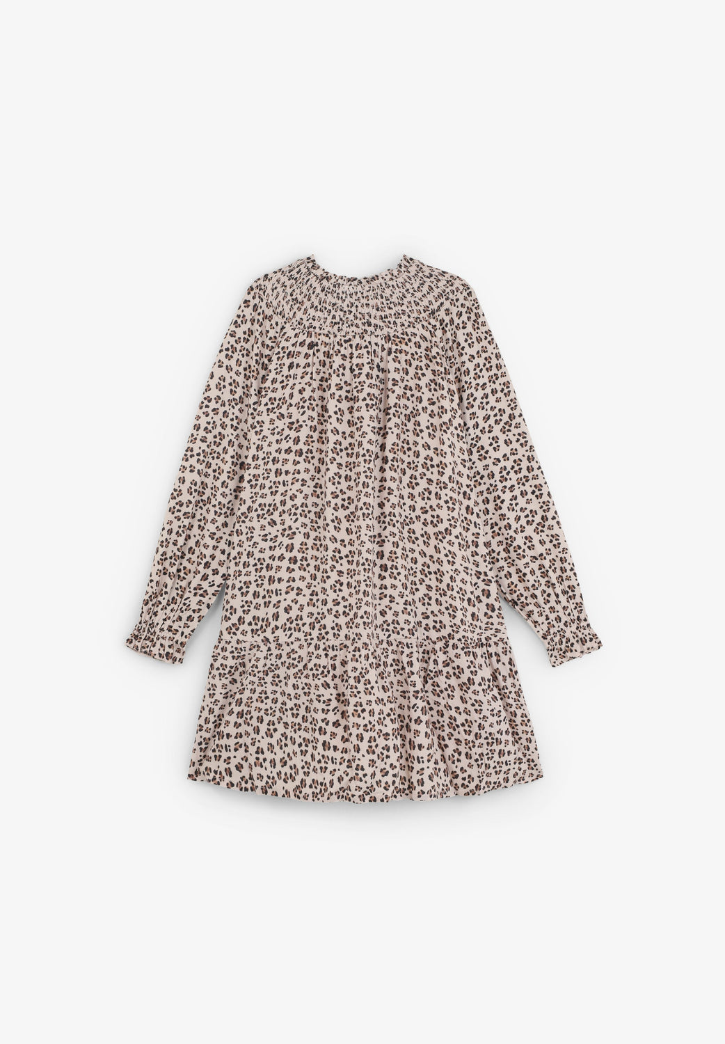 Mini dress made of 100% viscose. Animal print. Slightly puffed long sleeves. Smocked collar.