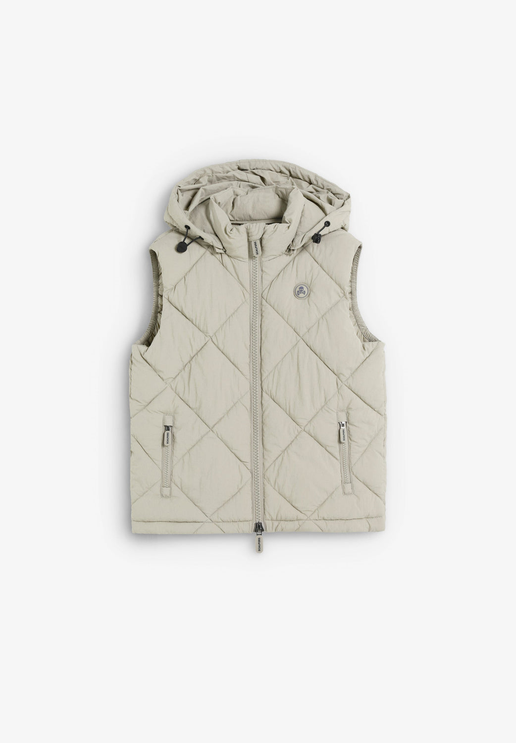Heavy-duty padded waistcoat with adjustable hood. Double slider zip fastening. Rubberised skull detail on chest. Zip pockets and an inner pocket