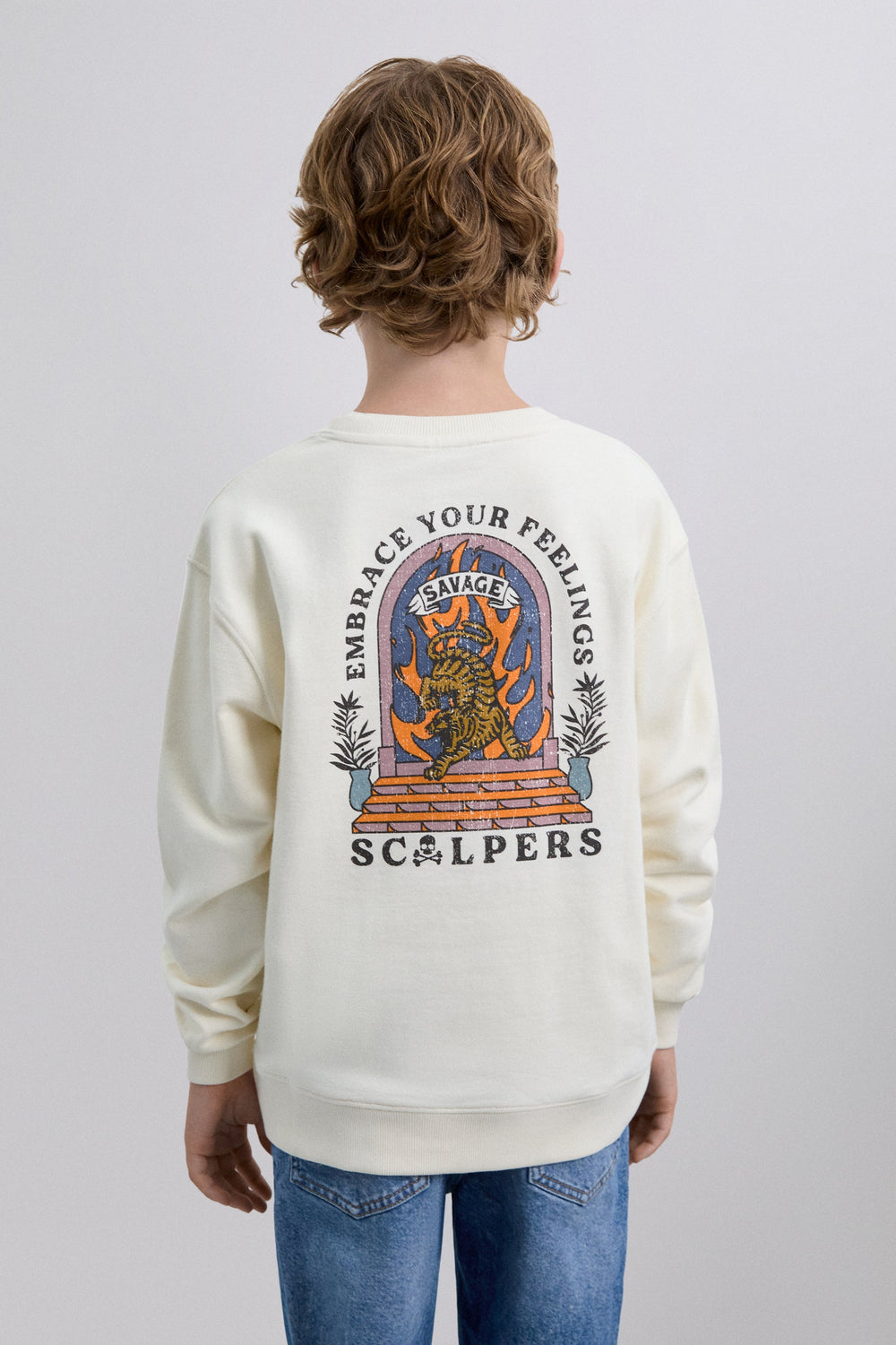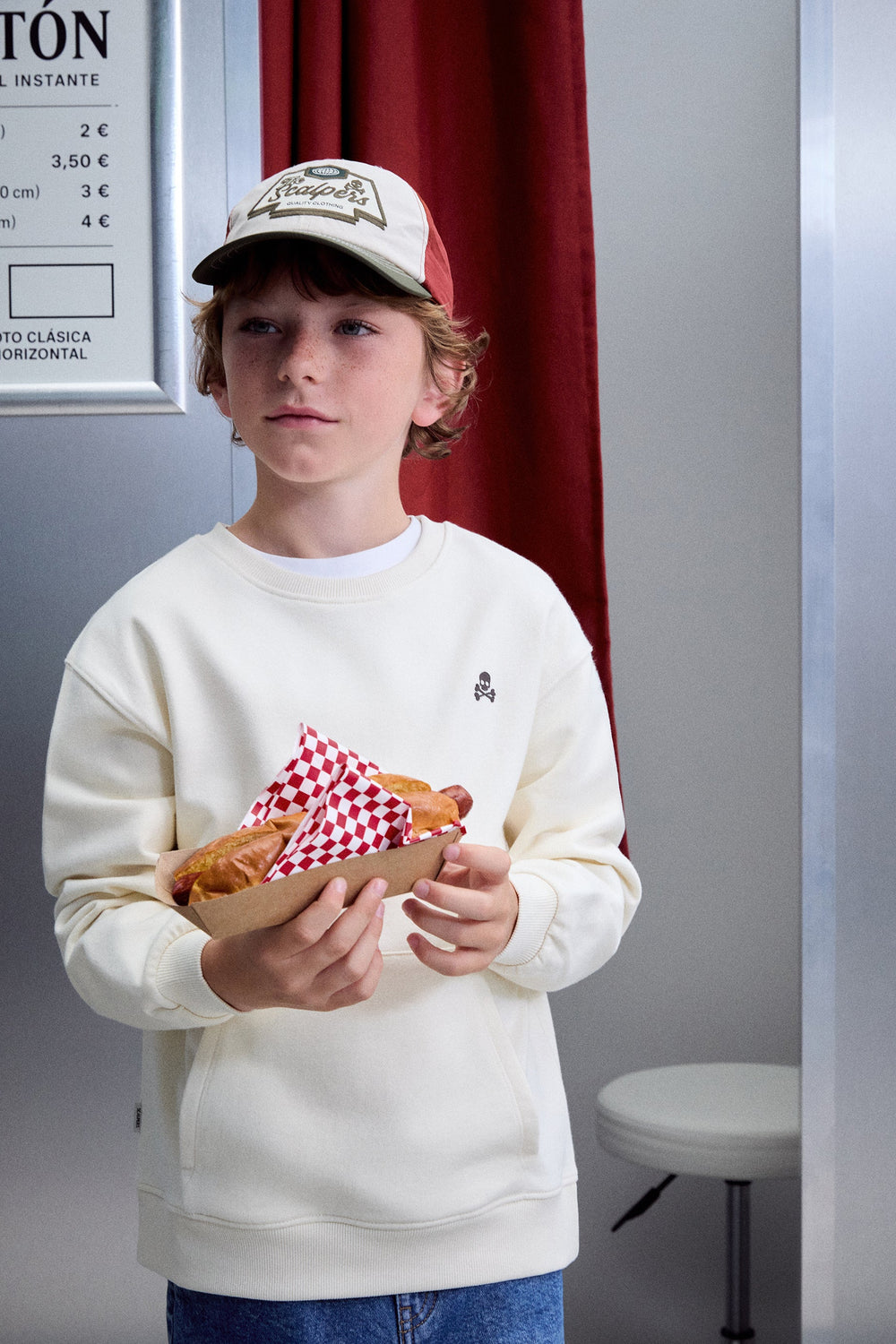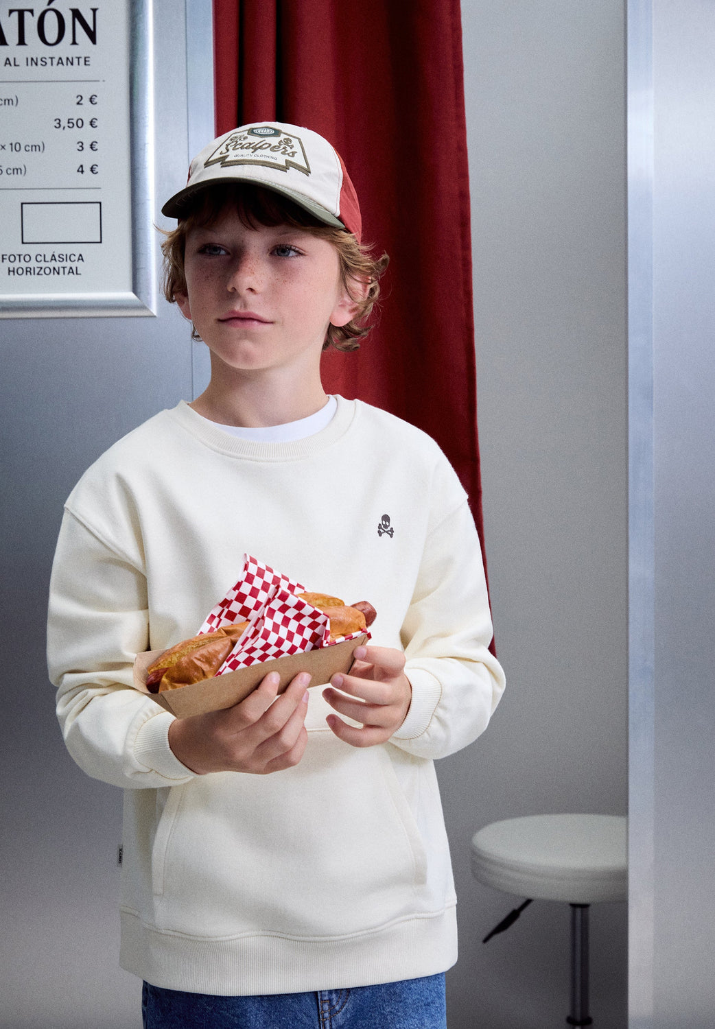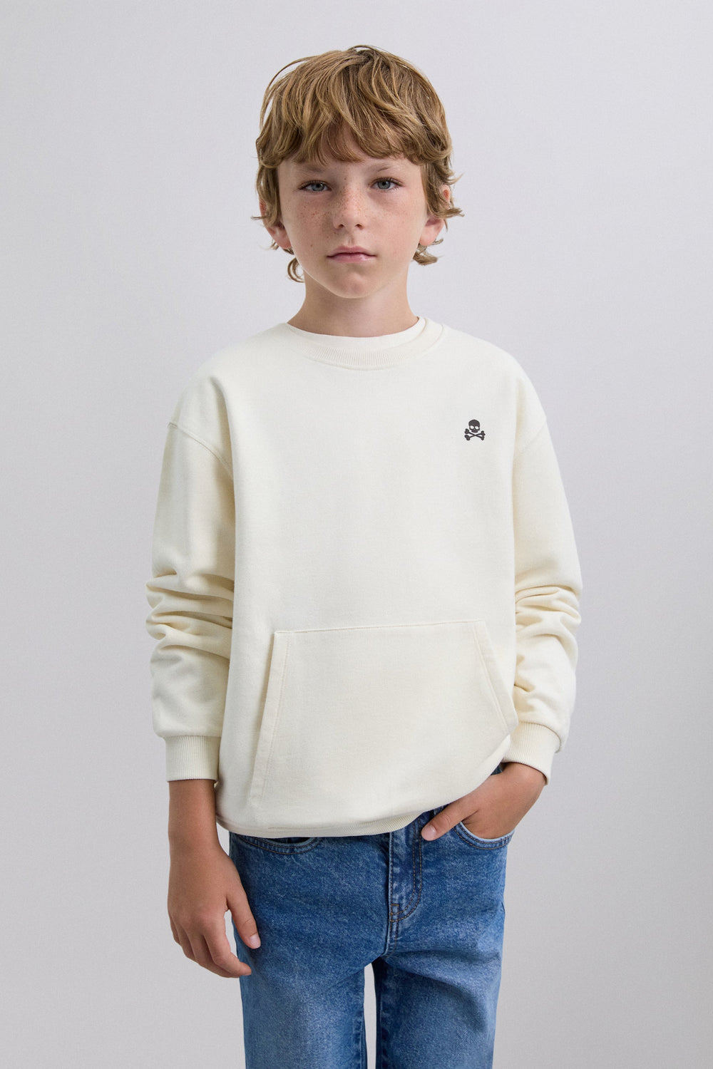 Sweatshirt made of 100% BCI cotton. Back print and skull detail on chest. Round neck. Long sleeves with cuffs and front pouch pockets.