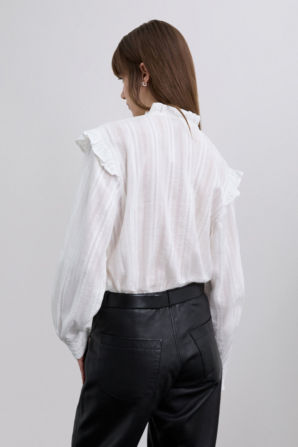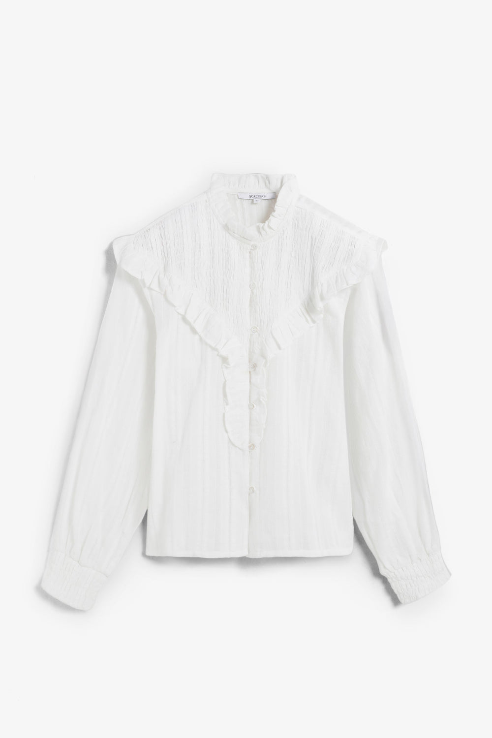 Long sleeve blouse made of 100% cotton. Classic collar and ruffle in smocked fabric. Mother-of-pearl buttons.