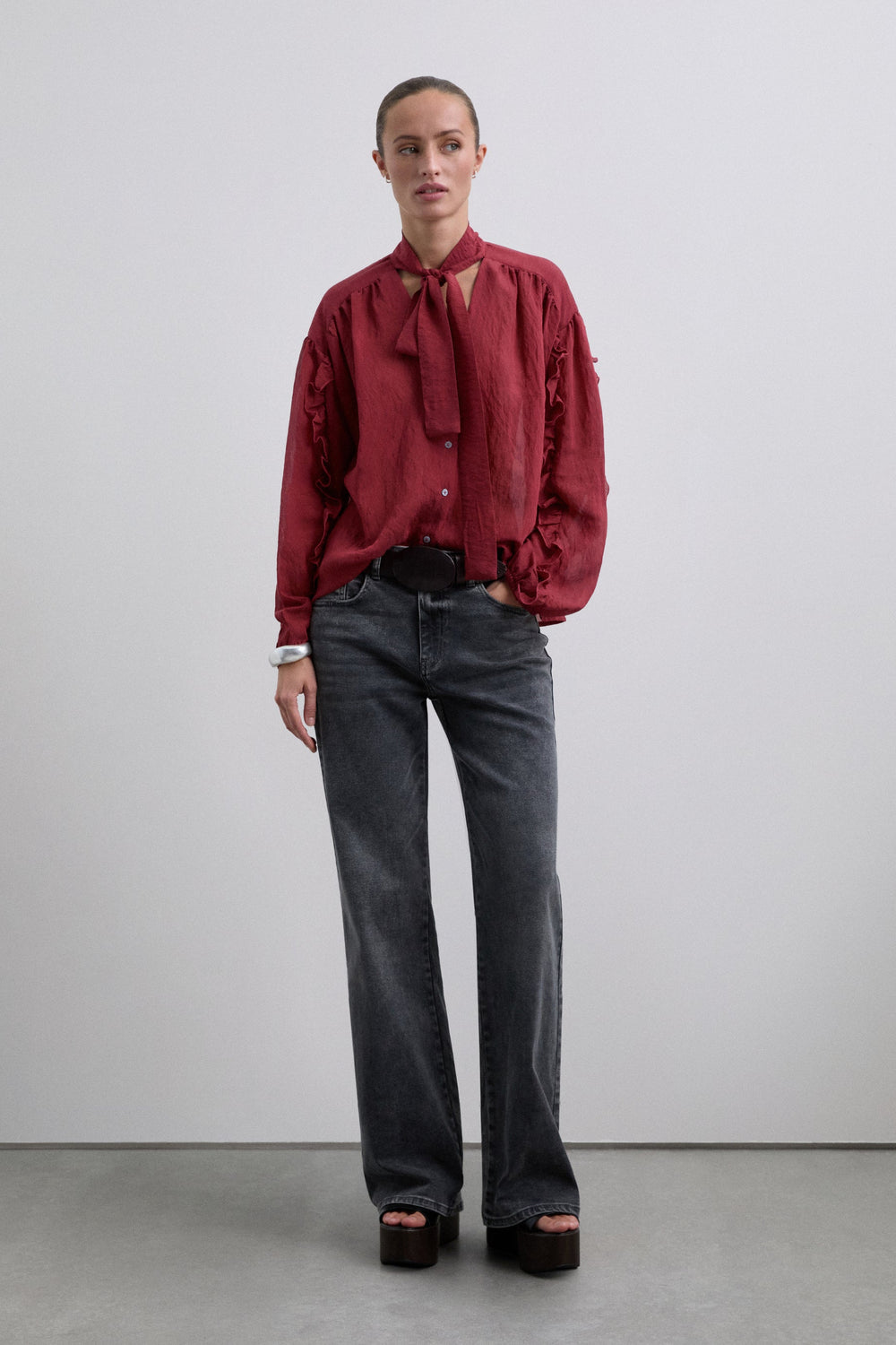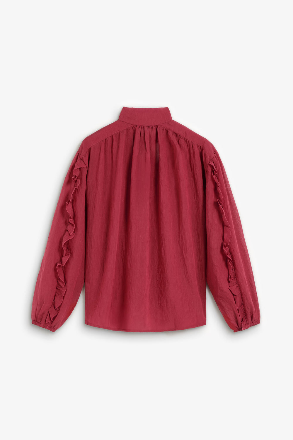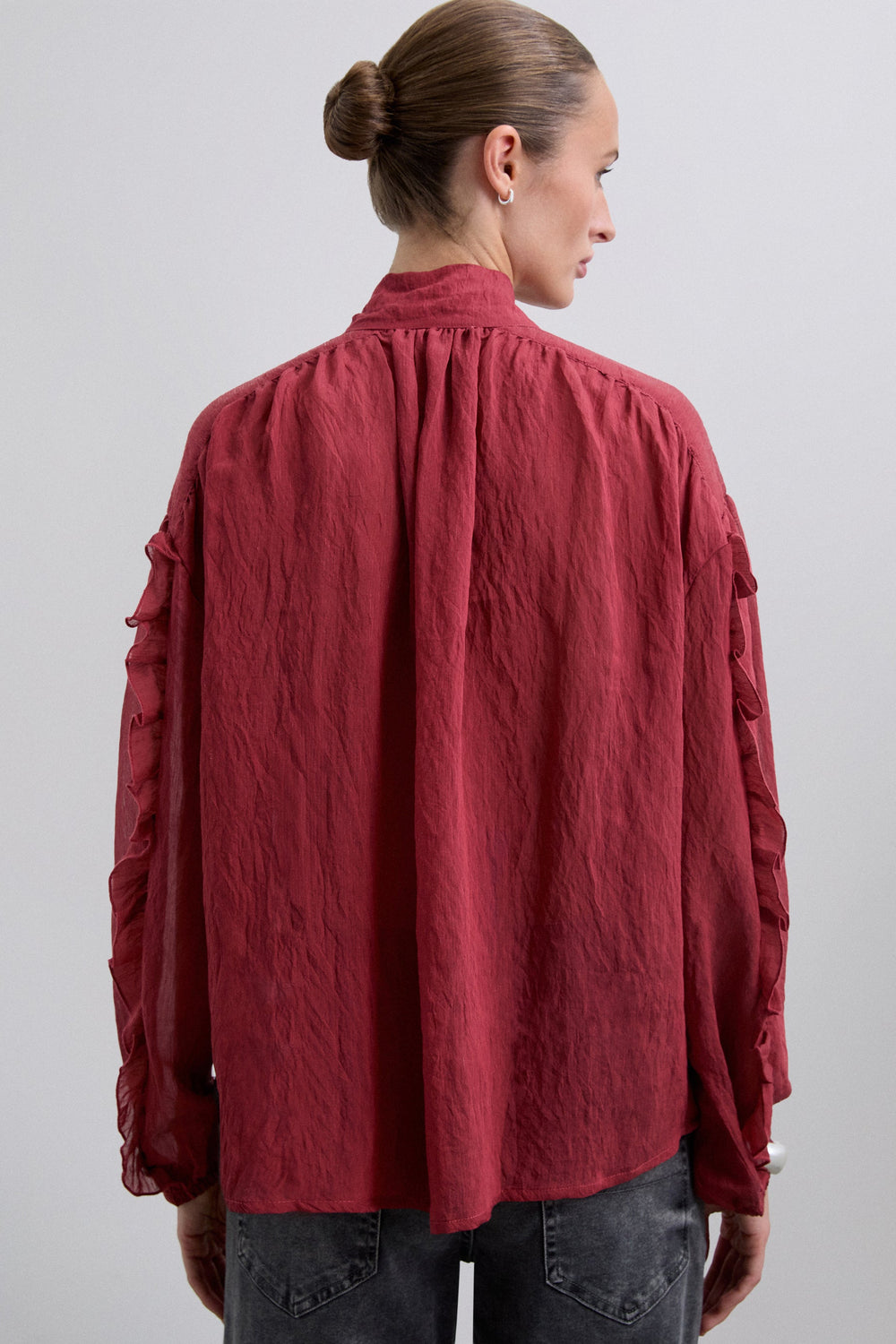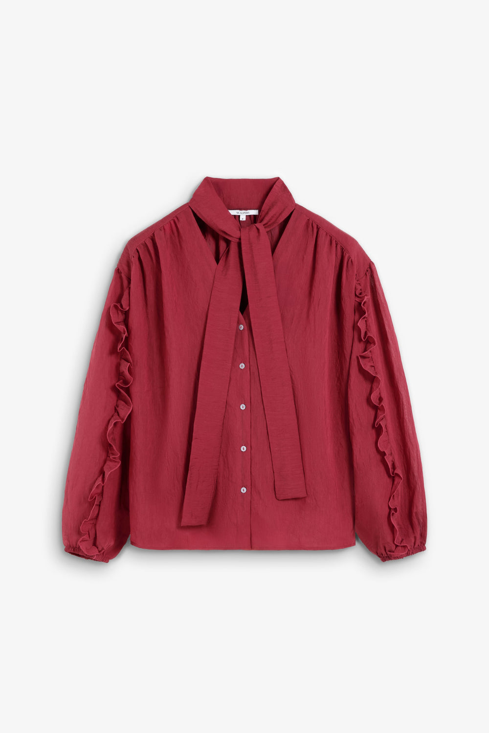 Blouse made of flowing fabric with linen and rayon. Regular Fit. Neckline with tie detail. Front button fastening. Long slightly puffed sleeves with cuffs. Ruffle detailing on the sleeves.