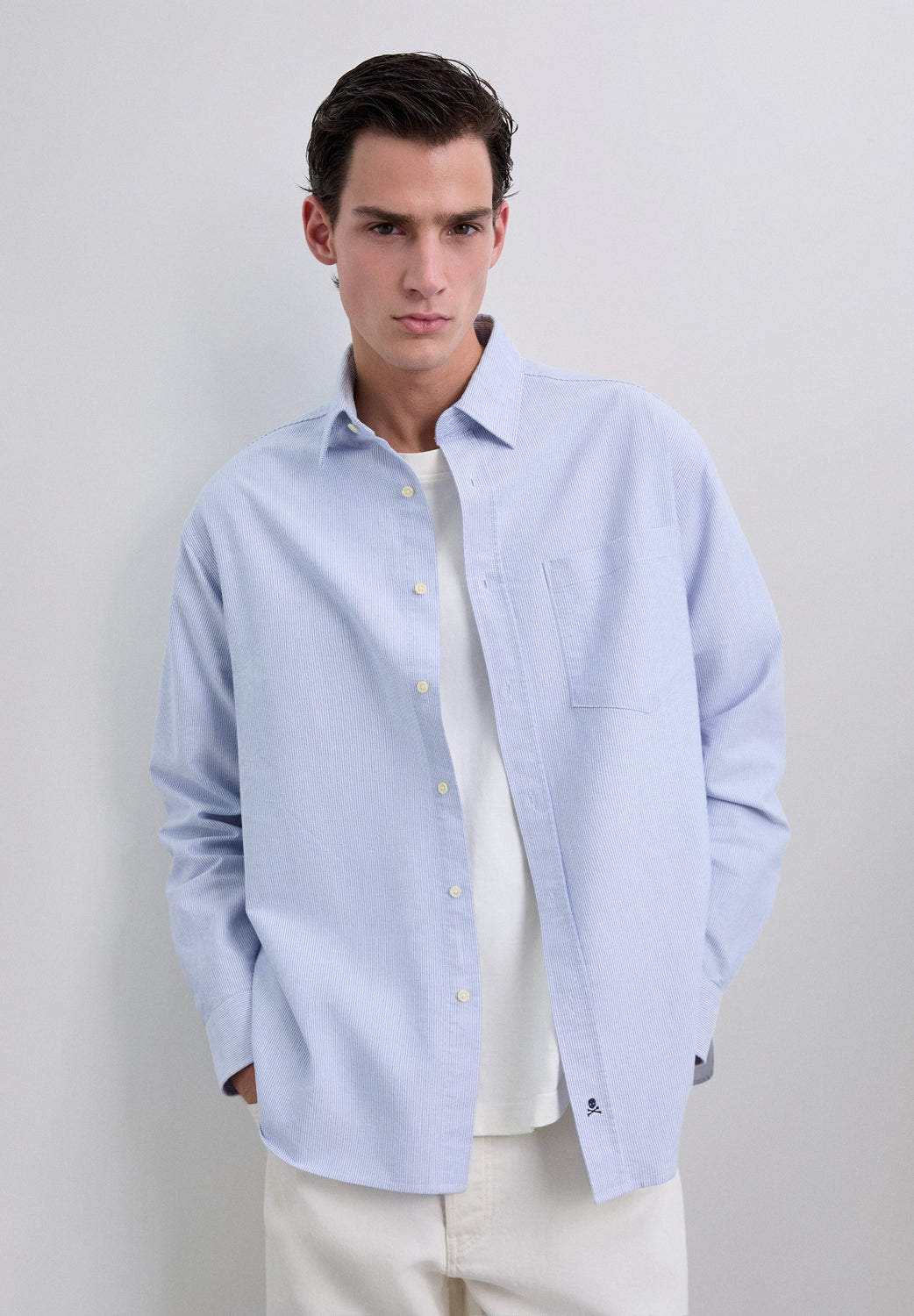 Shirt made of 100% BCI cotton. Stripe print. Chest pocket detail. Long sleeves. Button fastening at front and cuffs. Contrast embroidered skull detail on the lower front.